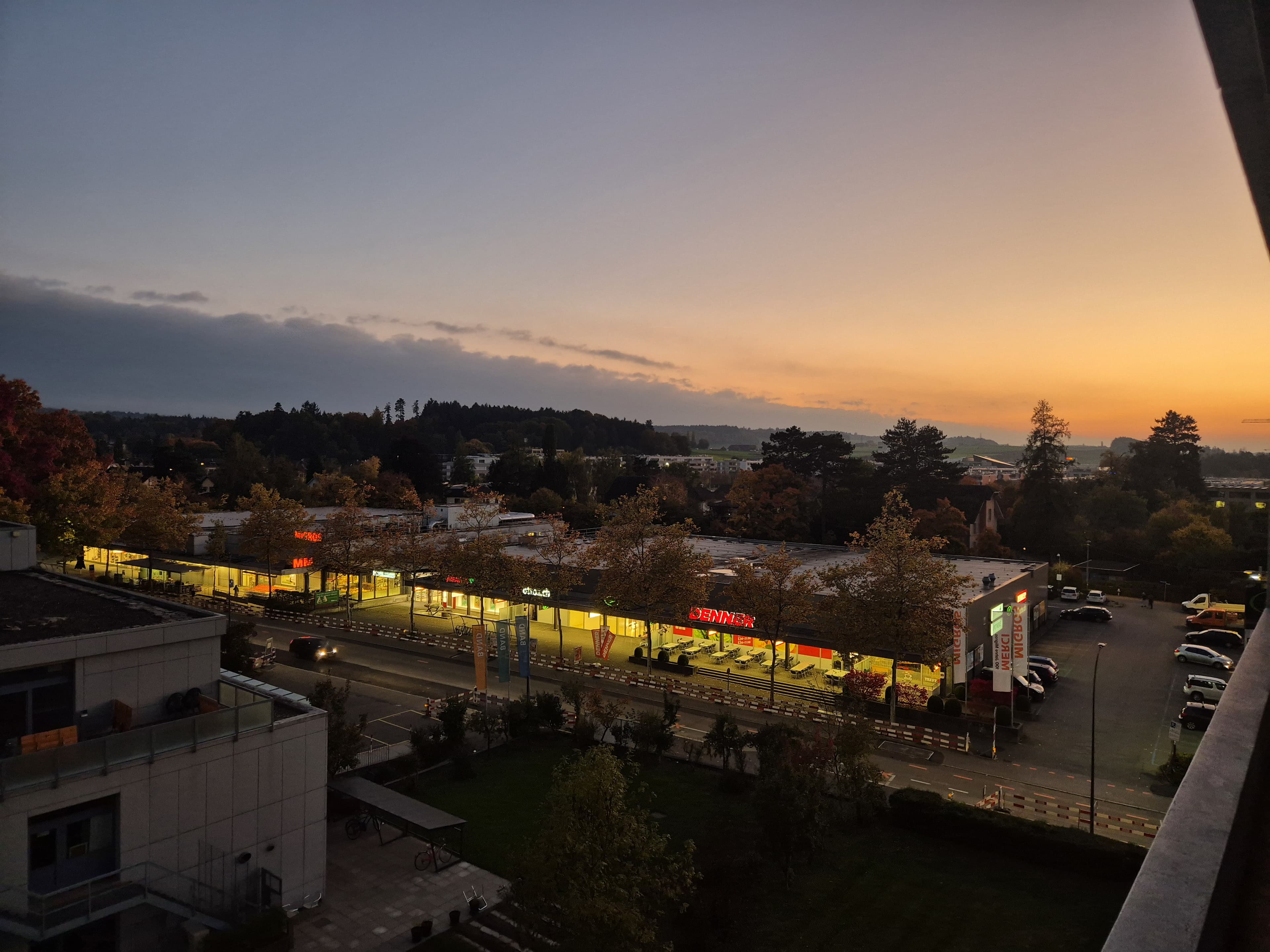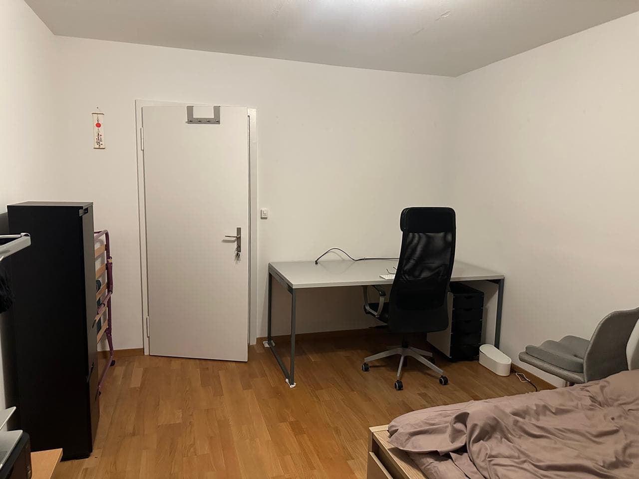 The rooms are located within a 4.5 apartment. The biggest room features three windows with curtains, allowing natural light or a view of the evening cityscape. It comes partially furnished, with a bed featuring a beige bedspread, a desk, a black office chair, a gray cushioned chair, a wardrobe with shelves, and a small black stool. The room has wooden flooring and a minimalist design, with a decorative hanging on the wall. The remaining furnishings are to be discussed with the leaving tenant. The rent is 730 CHF, covering all utilities and additional costs.