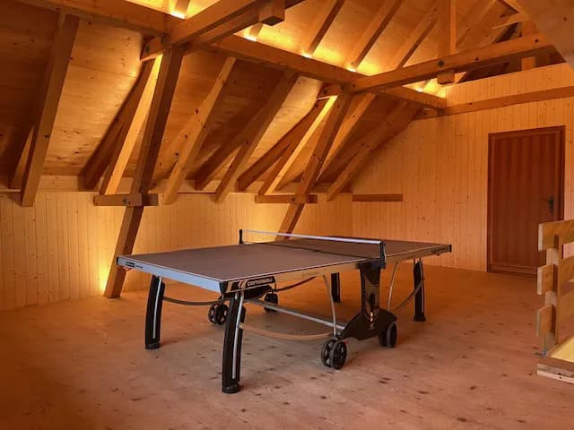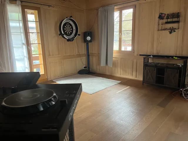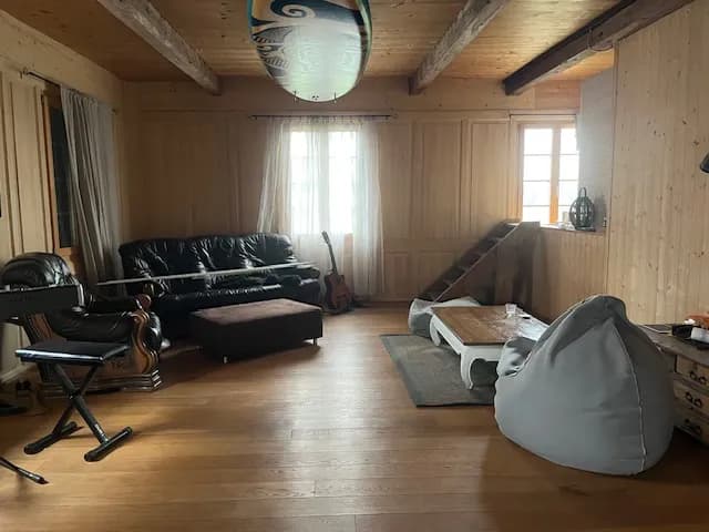 Der grosse Vorteil des Hauses liegt in den zahlreichen Gemeinschaftsräumen: Ein riesiges Atelier mit Steeldart-Scheibe, DJ-Pult, Lounge und Sauna, ein weiteres Atelier mit Ping-Pong-Tisch und zusätzlichem Raum für kreative oder sportliche Nutzung. Das Haus ist insgesamt sehr gut und konstant geheizt, zusätzlich verfügen wir über einen Kachelofen, einen Elektroherd sowie einen Bisson-Herd. Die Küche ist sehr geräumig und bietet ausreichend Platz für gemeinsames Kochen und Zusammensein. Das Bad hat eine Dusche aber keine Badewanne.