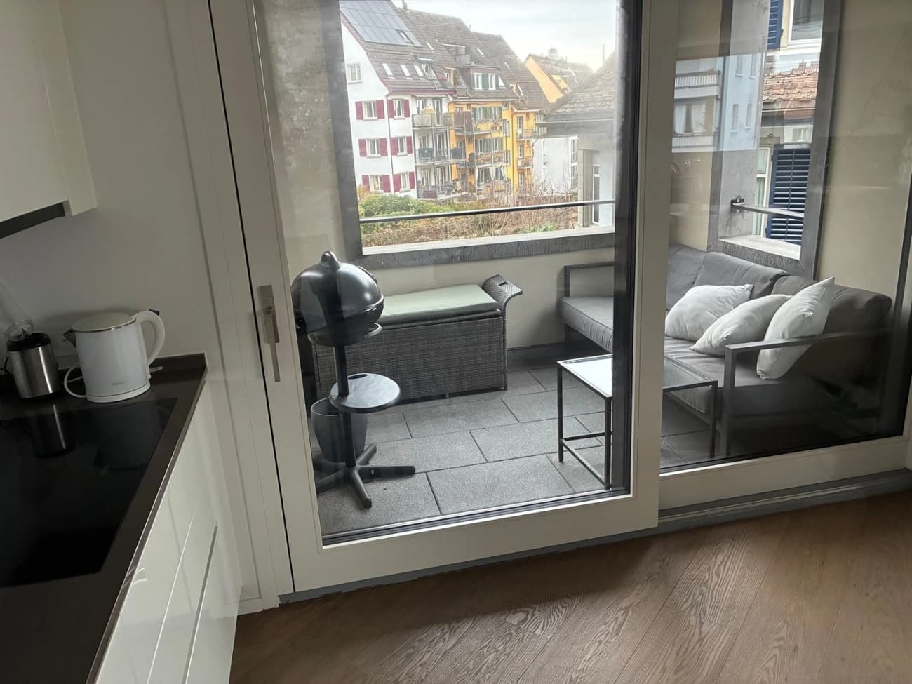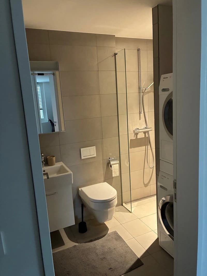 Es gibt eine moderne, voll ausgestattete Küche, einen grossen Balkon sowie Zugang zu einer gemeinsamen Dachterrasse mit Blick über ganz Zürich – perfekt für Sommerabende. Die Wohnung verfügt ausserdem über Waschmaschine und Trockner.
