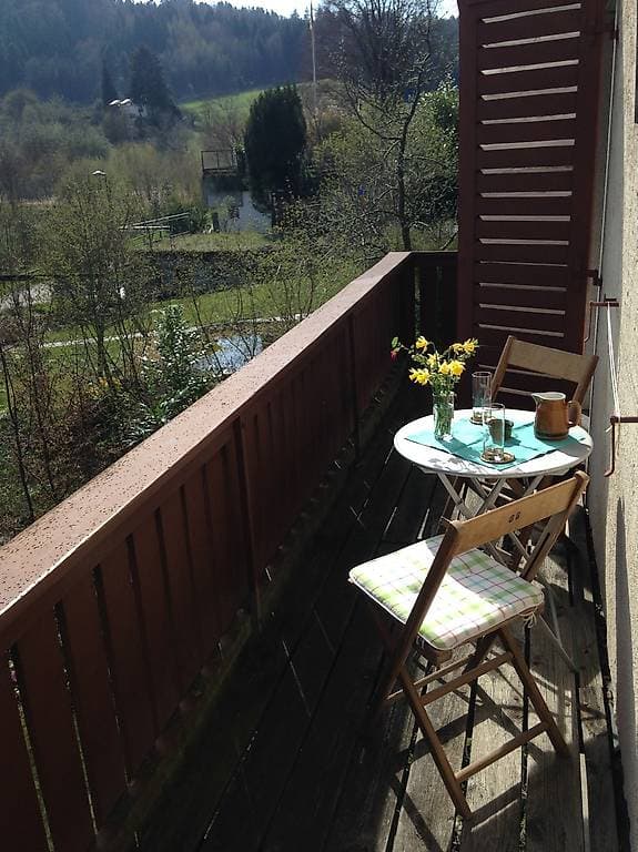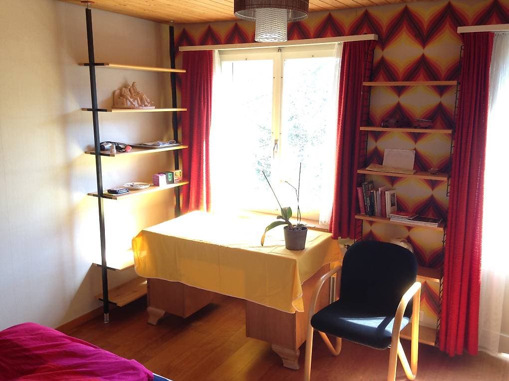 In grüner Lage, 2 Minuten zu Fuss vom BLS Bahnhof Burgdorf-Steinhof entfernt, ist in unserer internationalen EFH-WG ein geräumiges (möbliertes) Zimmer mit eigenem Balkon-Anteil ab 1. Dezember 25 zeitlich unbegrenzt zu vermieten.