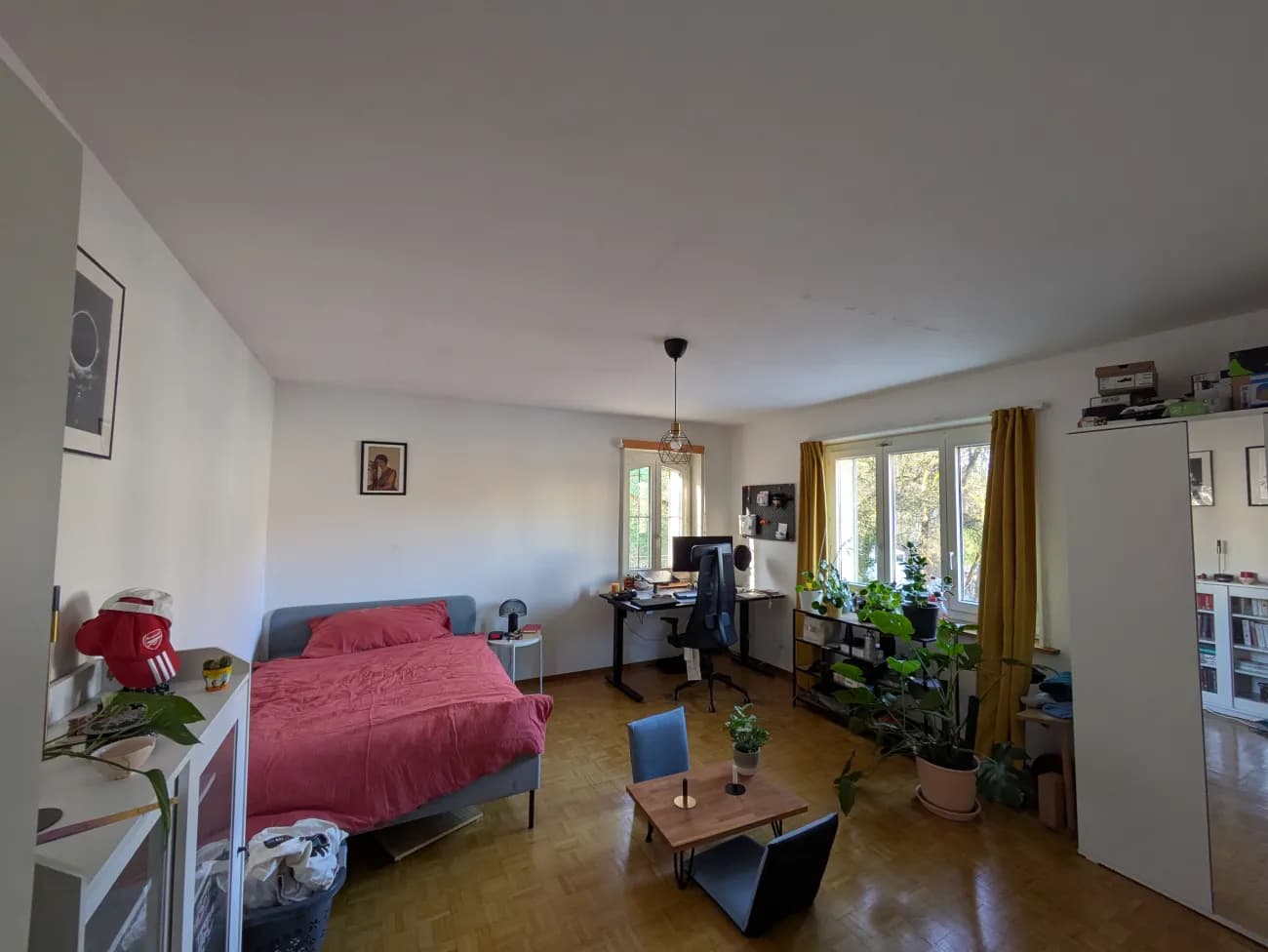 Das Zimmer ist ca. 5 x 5 m gross und geräumig mit grossem Fenster mit Abendsonne und einem kleinen Fenster mit Blick ins Grüne. Die Miete beträgt 656.- plus Nebenkosten.