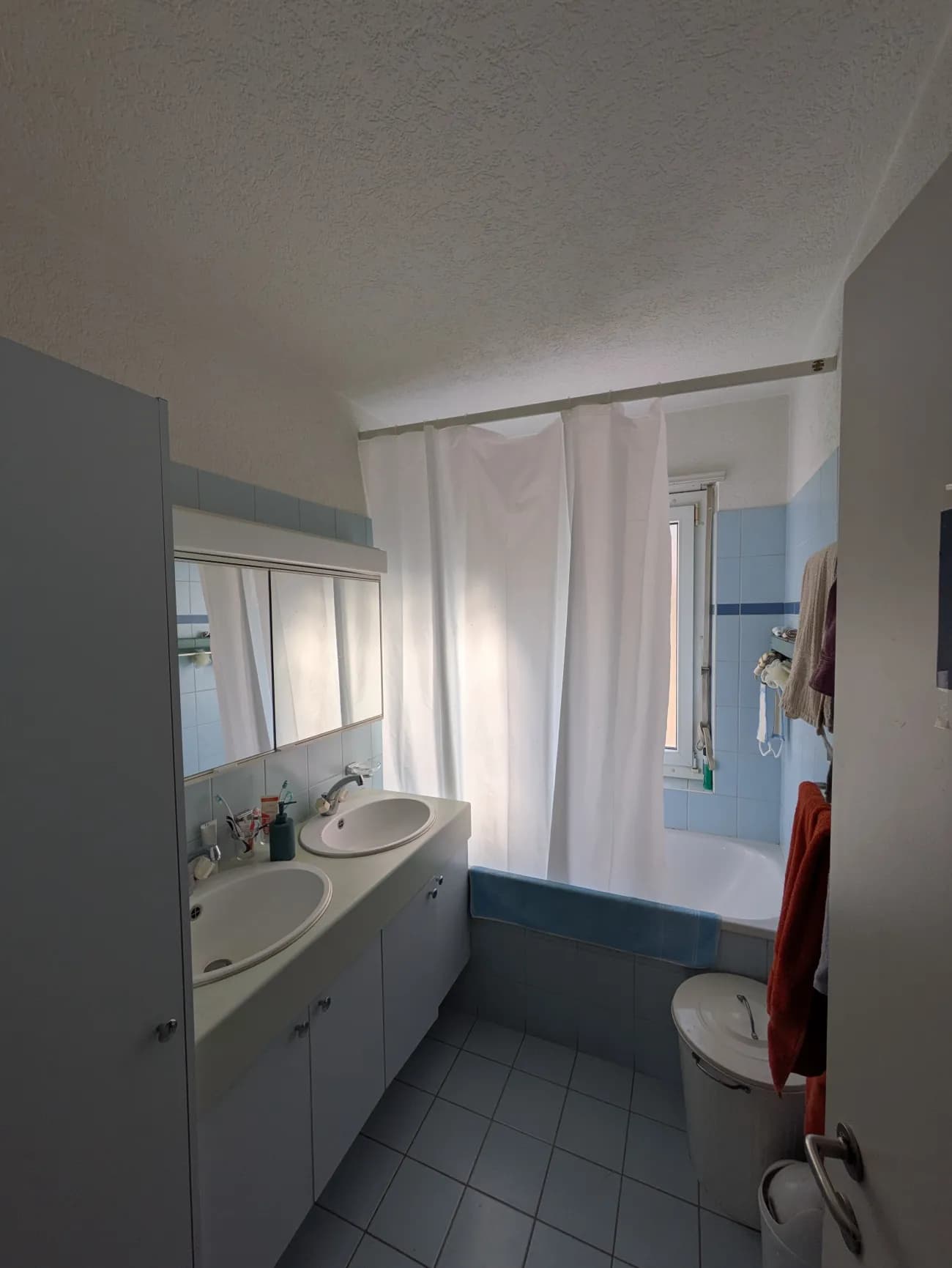 Ausserhalb deines Zimmers stehen dir ein Bad sowie ein separates WC, Balkon (mit Abendsonne), Wohnzimmer, Korridor mit Wandschränken, Küche (ohne Geschirrspülmaschine) und Kellerabteil zur Mitbenutzung zur Verfügung. Waschen ist unkompliziert: spontan oder auf dem Wochenplan eintragen. Trockenraum und Tumbler vorhanden.