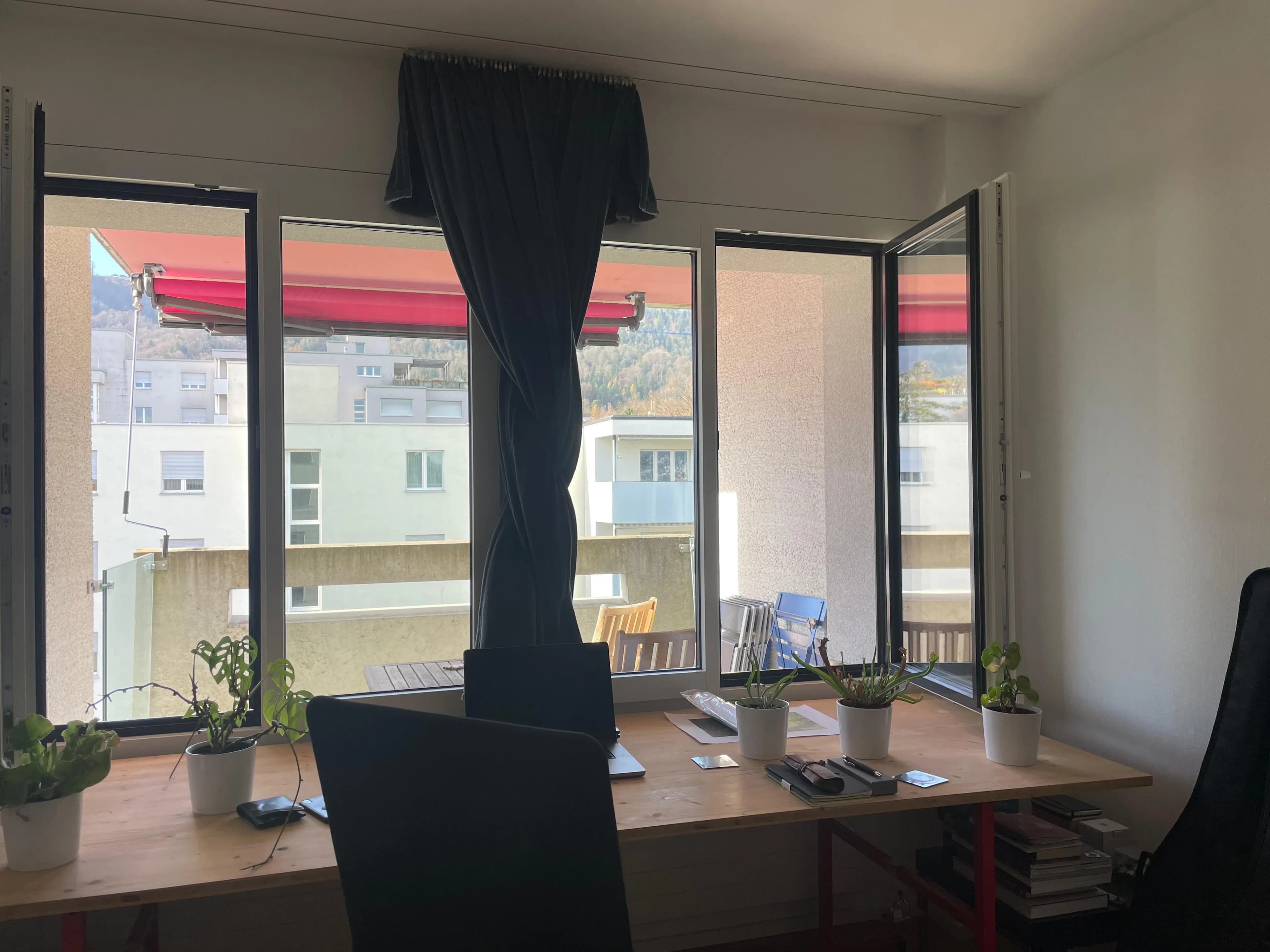 Dès Janvier2 semaines en ligneObergeschoss auf insgesamt 95m2 mit 2 Balkonen, vielen Pflanzen, Waschmaschine und viel Platz.