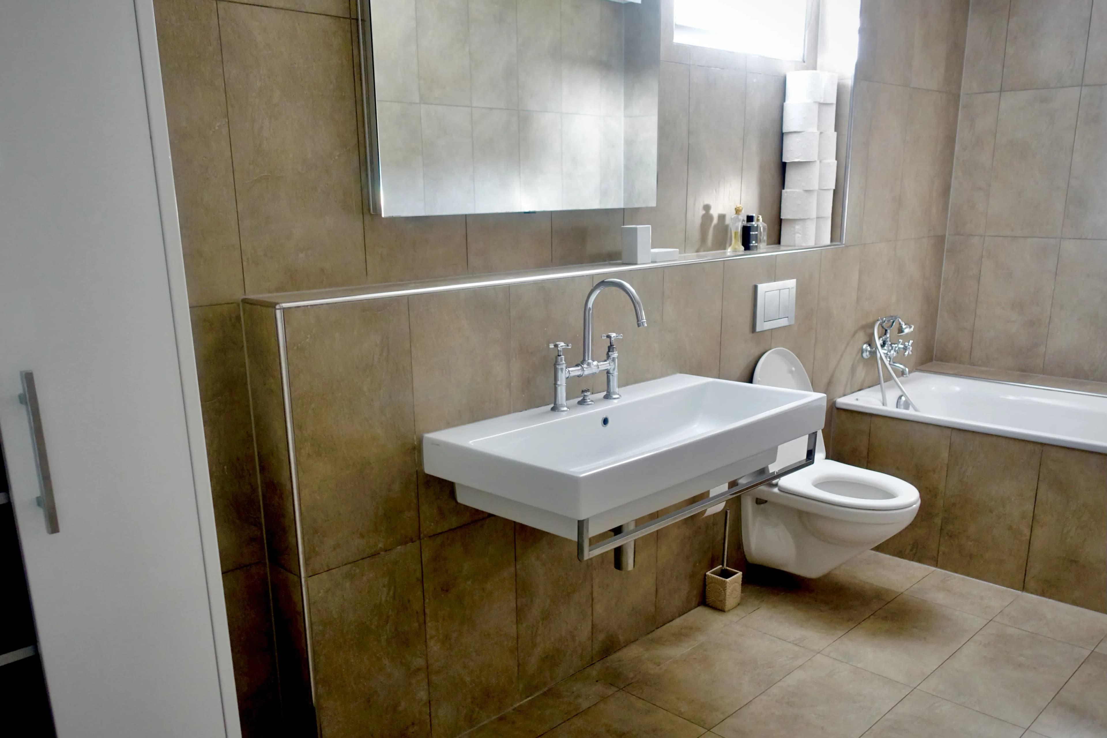 8m2 bathroom with WC, bathtub, double washbasin and cupboard on the same floor (exclusively for these two rooms)