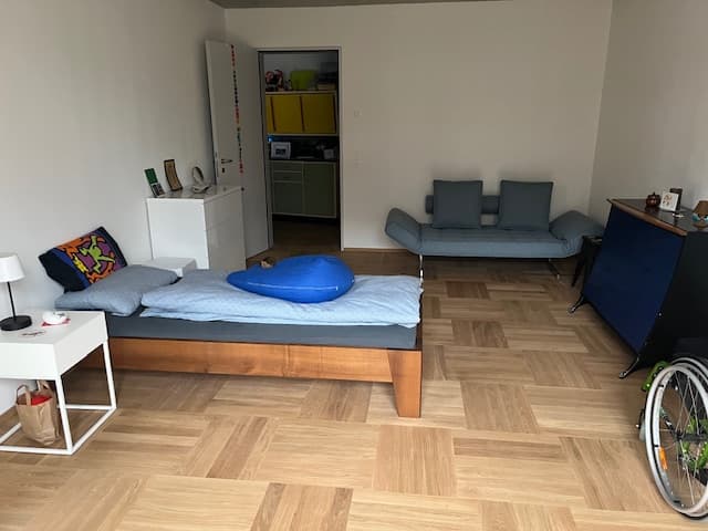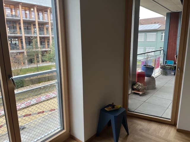 www.allee-9.ch ein Hausgemeinschaftsprojekt; innerhalb dieser Hausgemeinschaft in einer WOHNGEMEINSCHAFT zu Dritt (in einer 4,5 Zi-Whg) das grösste/schönste WG-Zimmer (22,5 m2), mit Nachmittags-/AbendSonne, barrierefrei, Haus mit Lift, eigener Zugang auf Balkon, eigenes Badezimmer zu vermieten für CHF 1000 pro Monat (Zeitpunkt: Nach Vereinbarung). Hausgemeinschaft Allee 9 "Leben in Vielfalt" leben Menschen mit (sichtbarer) Behinderung & Menschen ohne sichtbarem Handicap auf 4 Etagen, mit diversen Gemeinschaftsräumen (siehe: www.allee-9.ch). Michel & Mariann Schütz (Geschwister) leben mit Dir in der 4,5 Zi-Wohnung zusammen.