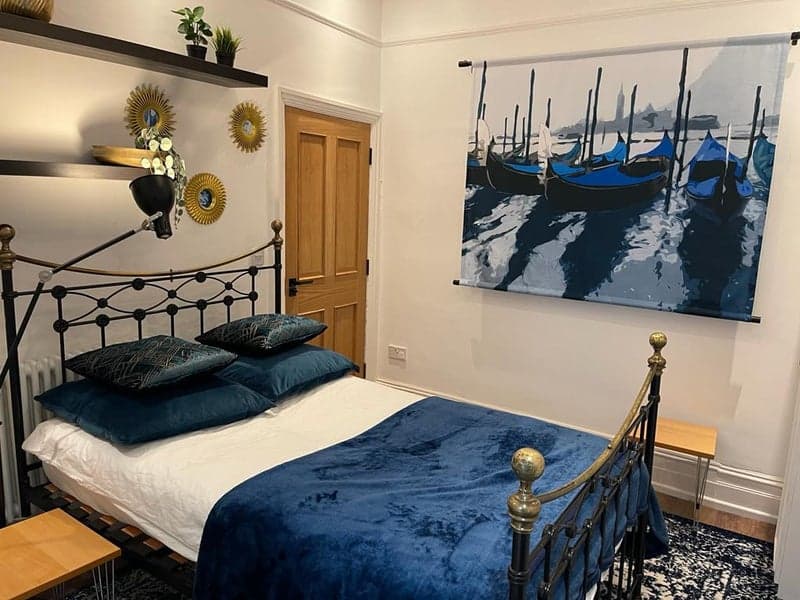 Une chambre principale spacieuse et lumineuse, entièrement meublée avec sa salle de bain privée, est disponible dans un élégant appartement de deux pièces situé à l’Avenue de Champel 161.