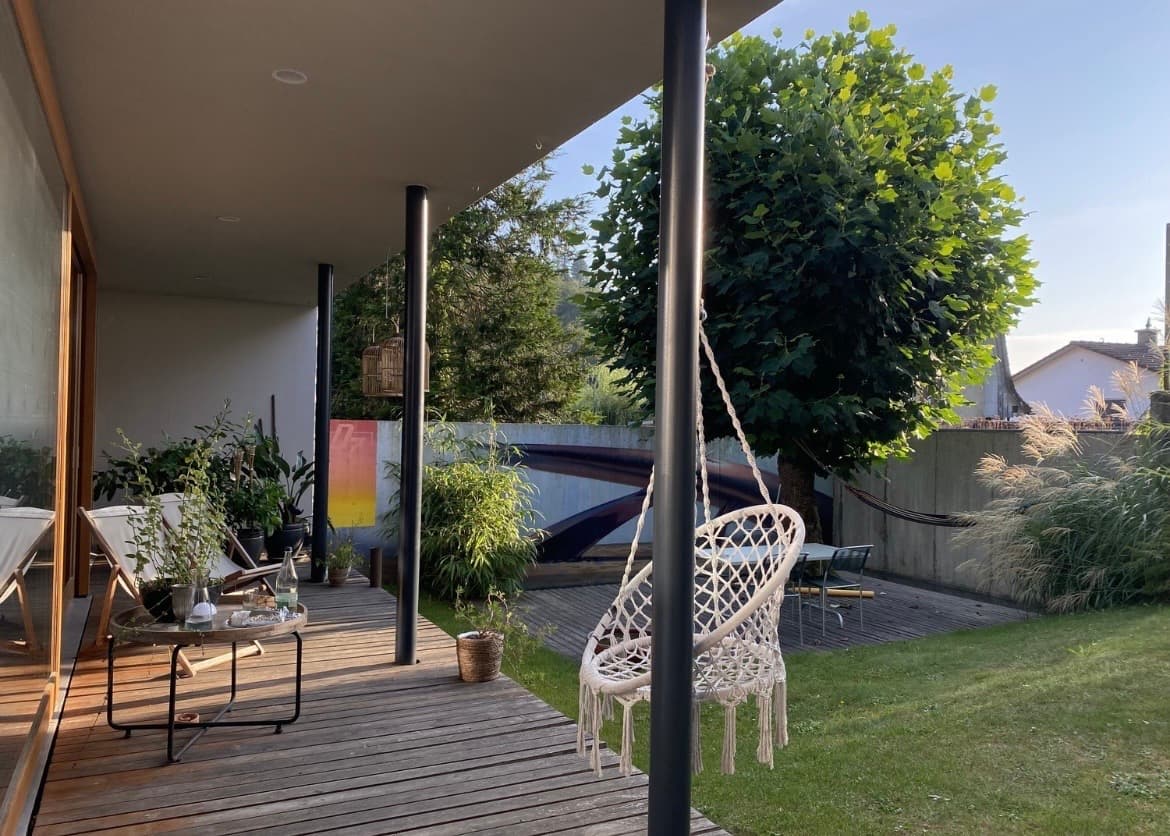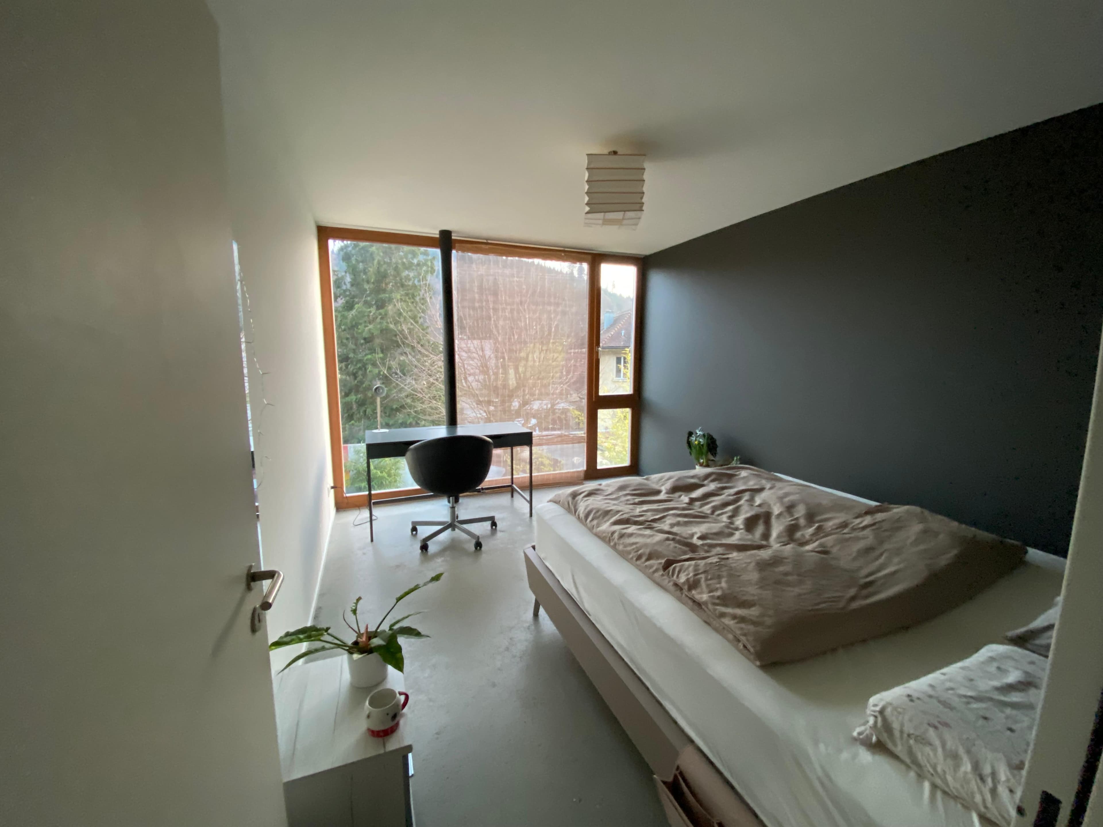 Das WG-Zimmer befindet sich in einem Haus, das sich über zwei Etagen erstreckt. Es ist möbliert oder unmöbliert zu haben, die vorhandene Ausstattung kann vollständig verstaut werden, damit das Zimmer frei für deine persönliche Einrichtung ist und umfasst 14 Quadratmeter. Du benötigst keinen Kleiderschrank, da Einbauschränke vorhanden sind. Die WG mit eigenem Garten ist voll ausgestattet mit allem was man so braucht. Nicht auf den Bildern aber Teil der WG ist zudem ein grosszügiges, gemütliches Wohnzimmer mit TV. Bei uns lebt eine Katze, das darf dir nichts ausmachen, früher oder später streicht sie dir nämlich um die Beine! Zwischendurch haben wir auch Hundebesuch.