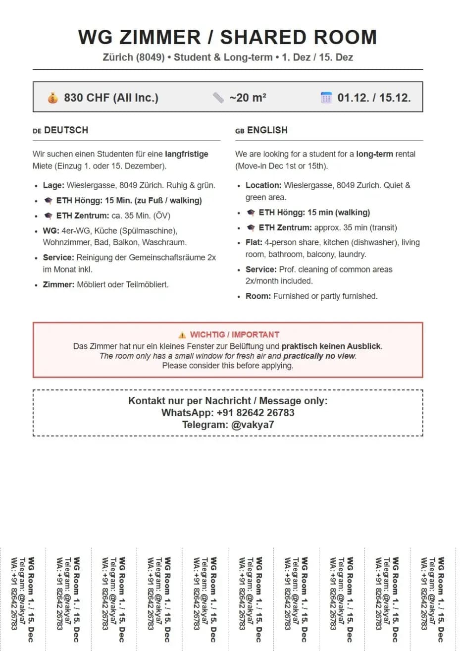 STUDENT ROOM: 15 min walk to ETH Hoenggerberg (Move-in Dec 1st or 15th)