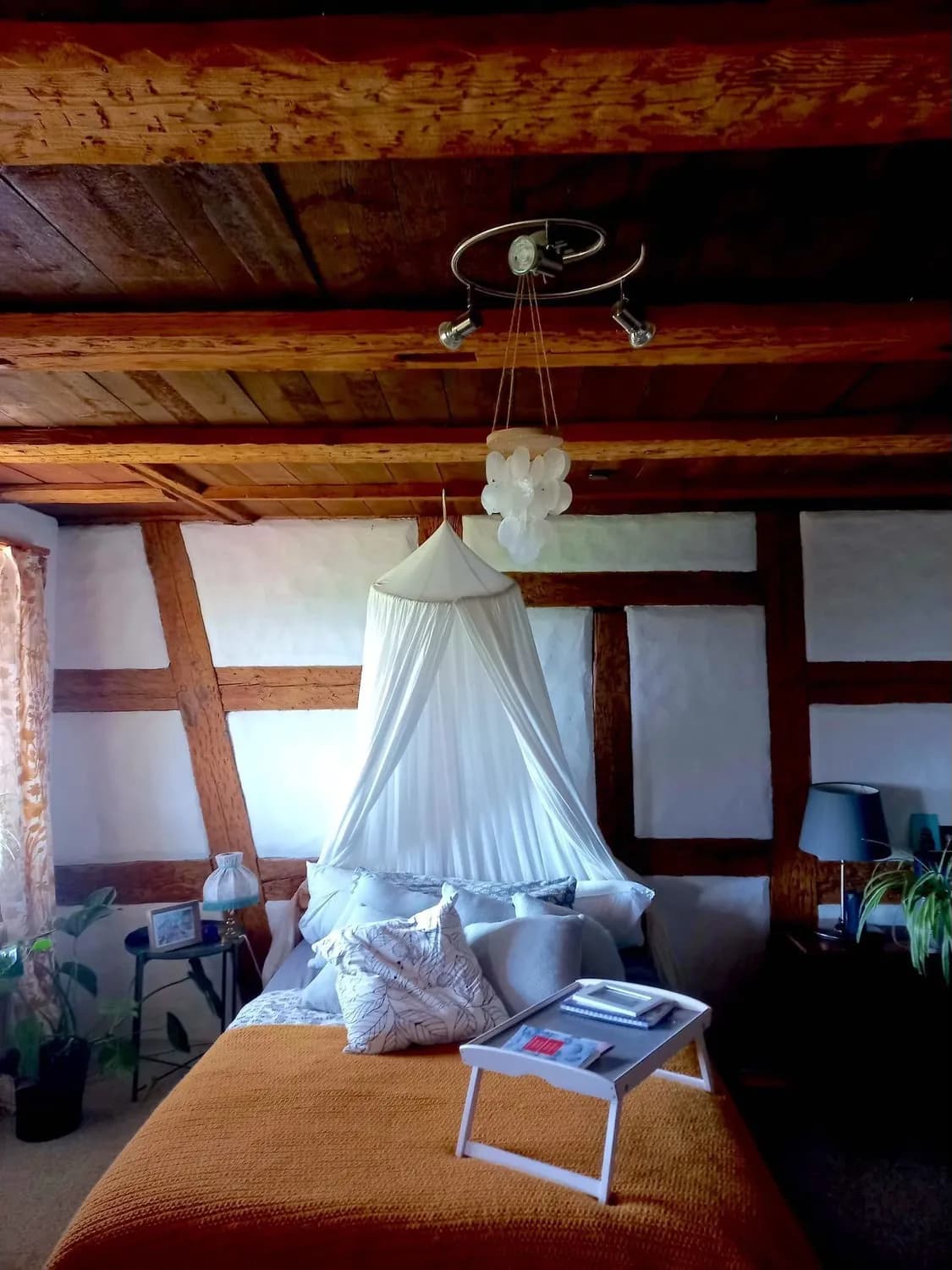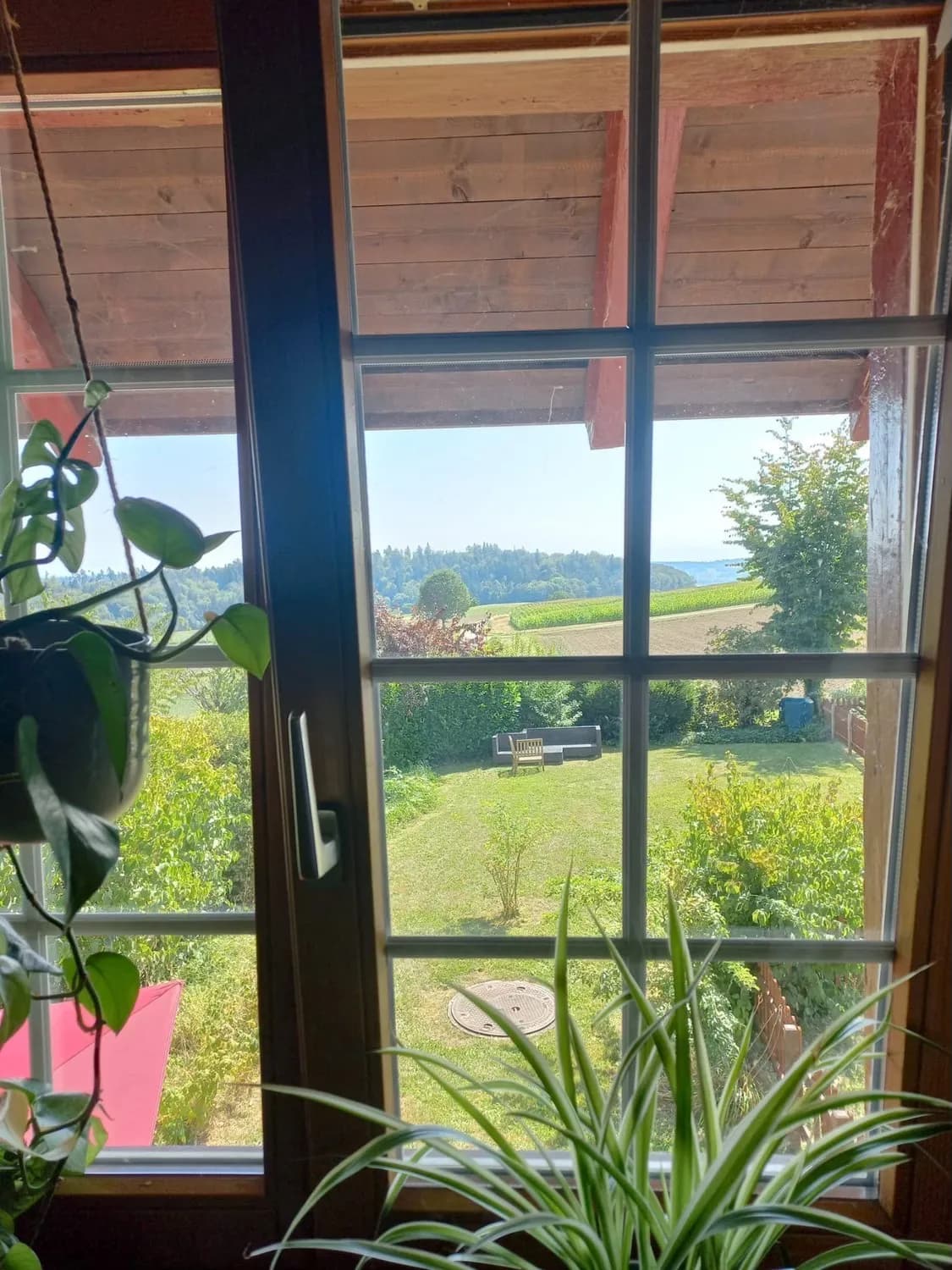 Das Zimmer liegt auf der Südseite unseres Hausteils und bekommt schöne Morgensonne. Von hier blickst du auf unseren Garten sowie in Richtung Alpen.?Sichtbare Holzgiebel und kleine architektonische Details verleihen dem Raum Charakter. Der helle Teppichboden sorgt zusätzlich für eine gemütliche Atmosphäre.?Ein Badezimmer mit Badewanne befindet sich auf derselben Etage.