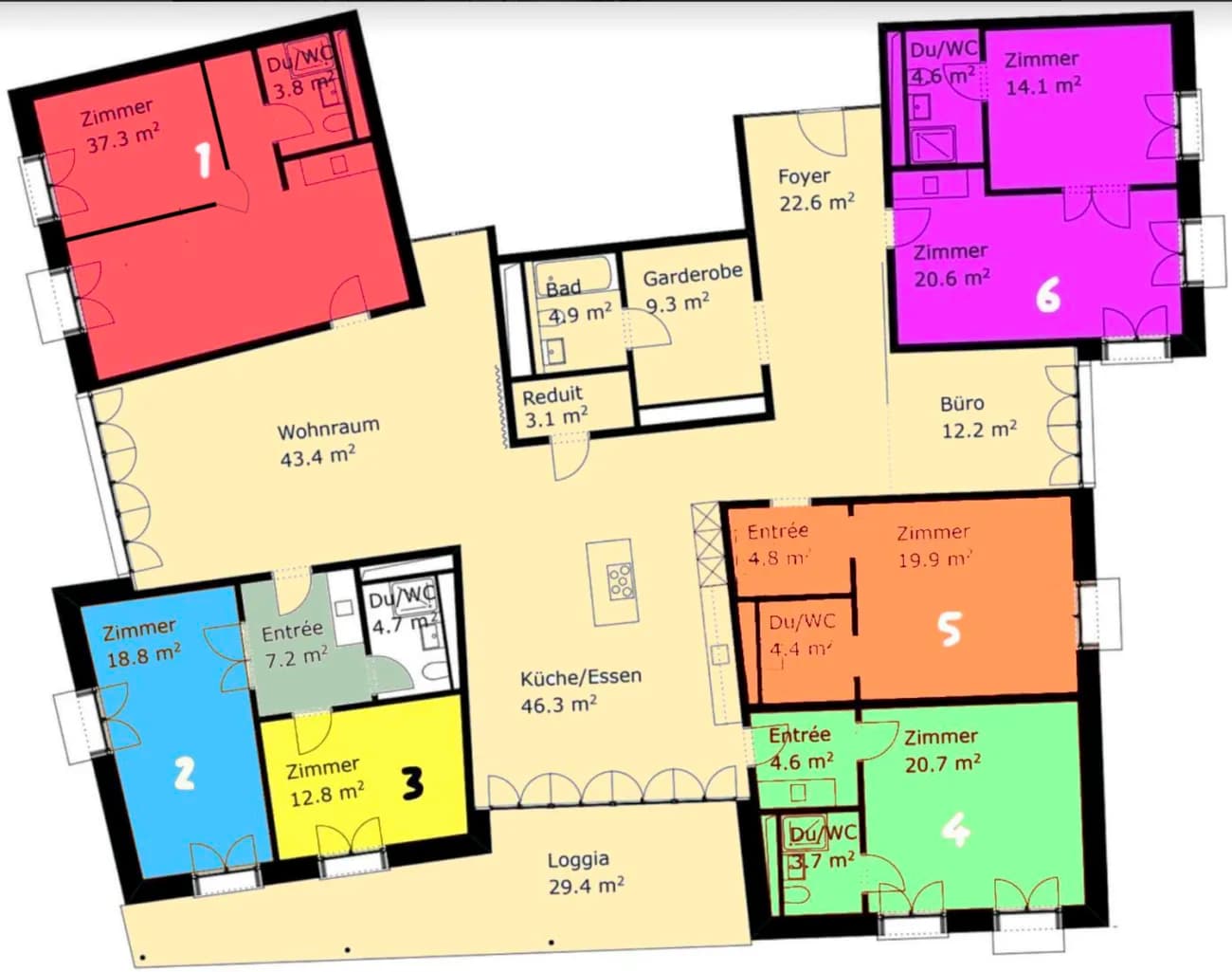 Ausserhalb vom Cluster stehen dir/euch ausserdem insgesamt 171 m2 Gemeinschaftsraum zur Verfügung, der eine grosszügige Stube mit Sofas und Beamer, sowie eine grosse Küche, einen Essbereich mit grossem Balkon sowie eine Homeoffice Ecke beinhaltet.