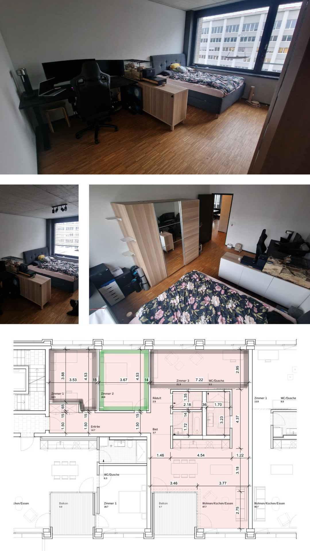 Das freie Zimmer ist *16.6 m² gross*, rechteckig geschnitten und gut möblierbar. Der Schrank und das Sideboard können bei Interesse abgekauft werden (beides Ikea und ca. 2 Jahre alt).