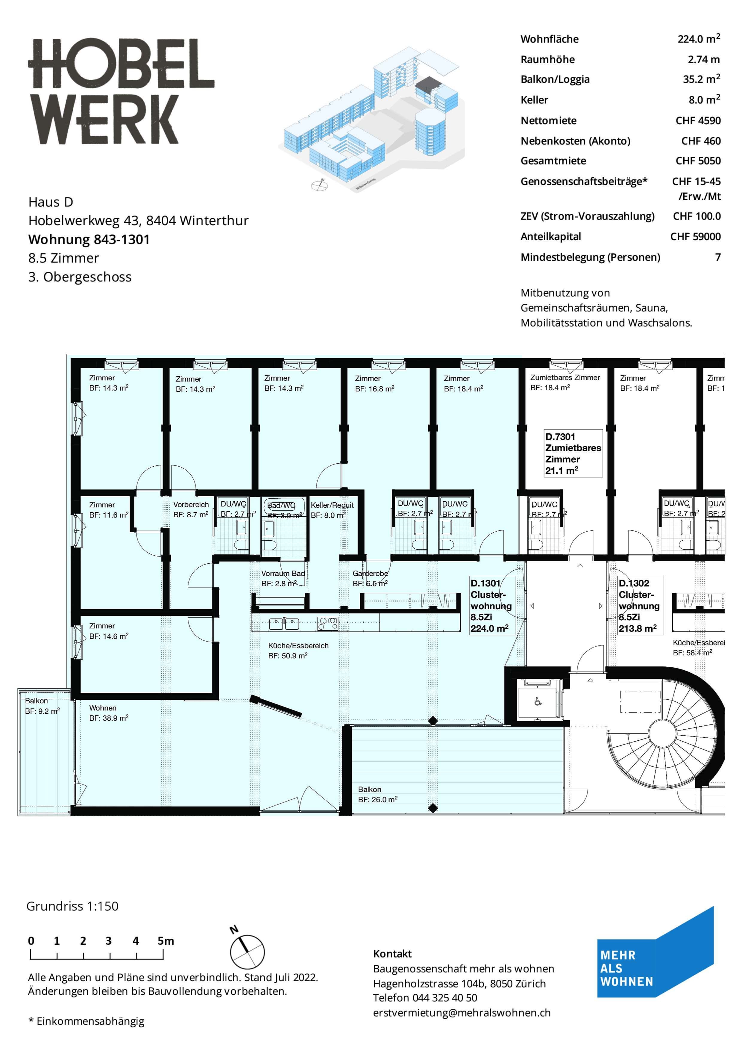 Unsere Wohnung liegt im obersten Stockwerk des mehrfach preisgekrönten Haus D im Hobelwerk Areal der Innovationsgenossenschaft mehr als wohnen und bietet hohe Wohnqualität. Die Wohnfläche beträgt insgesamt 245.1 qm (inkl. optionalem Zusatzzimmer). Davon umfasst die Gemeinschaftsfläche 103.3 qm mit einer grossen Wohnküche mit grosszügigem Balkon Richtung Süden, ein Wohnzimmer mit Balkon Richtung Westen, eine Gästetoilette sowie ein kleines Reduit. Von der Gemeinschaftsfläche gehen die einzelnen Cluster (3-er, 2-er und 1-er) mit eigenem Bad ab (siehe Grundrissplan). Die Bilder zeigen Beispielhaft das 2-er Cluster. Der Ausbaustand der anderen Cluster ist äquivalent.