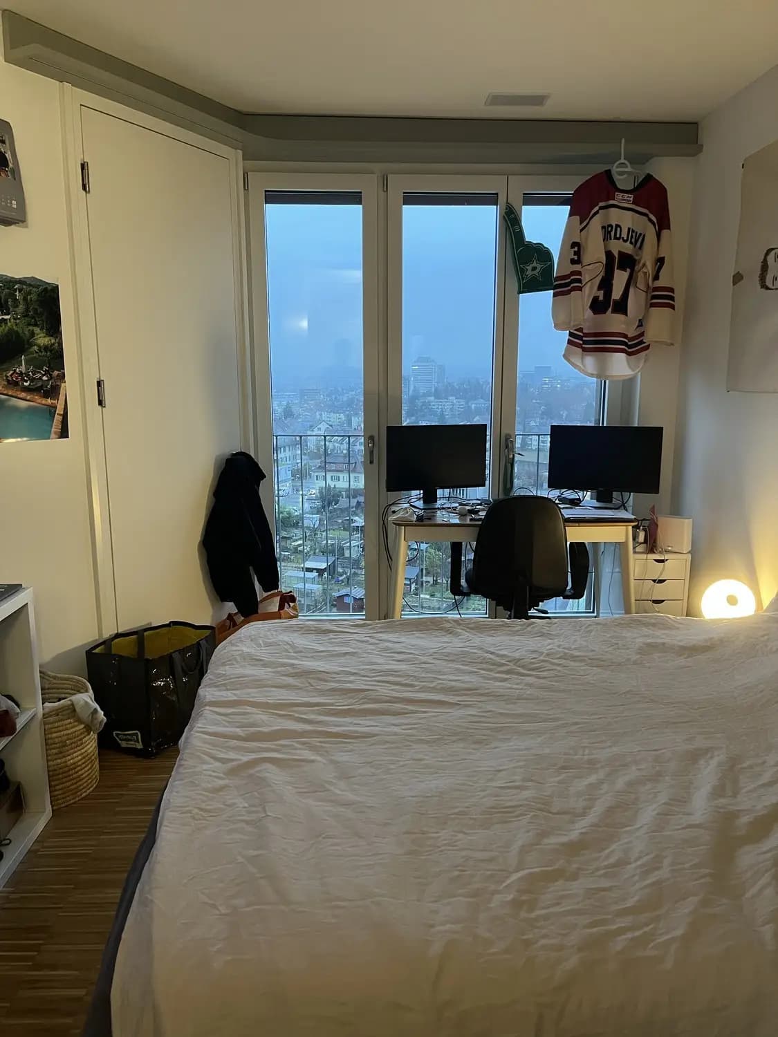 Die Wohnung ist hell, hat zwei Balkonen (viel Sonne, tolle Ausicht) direkt am Waldrand. Tramstationen Brunnenhof/Bucheggplatz sind in 5–10 Minuten erreichbar – von dort ist man schnell im Zentrum oder in Oerlikon.