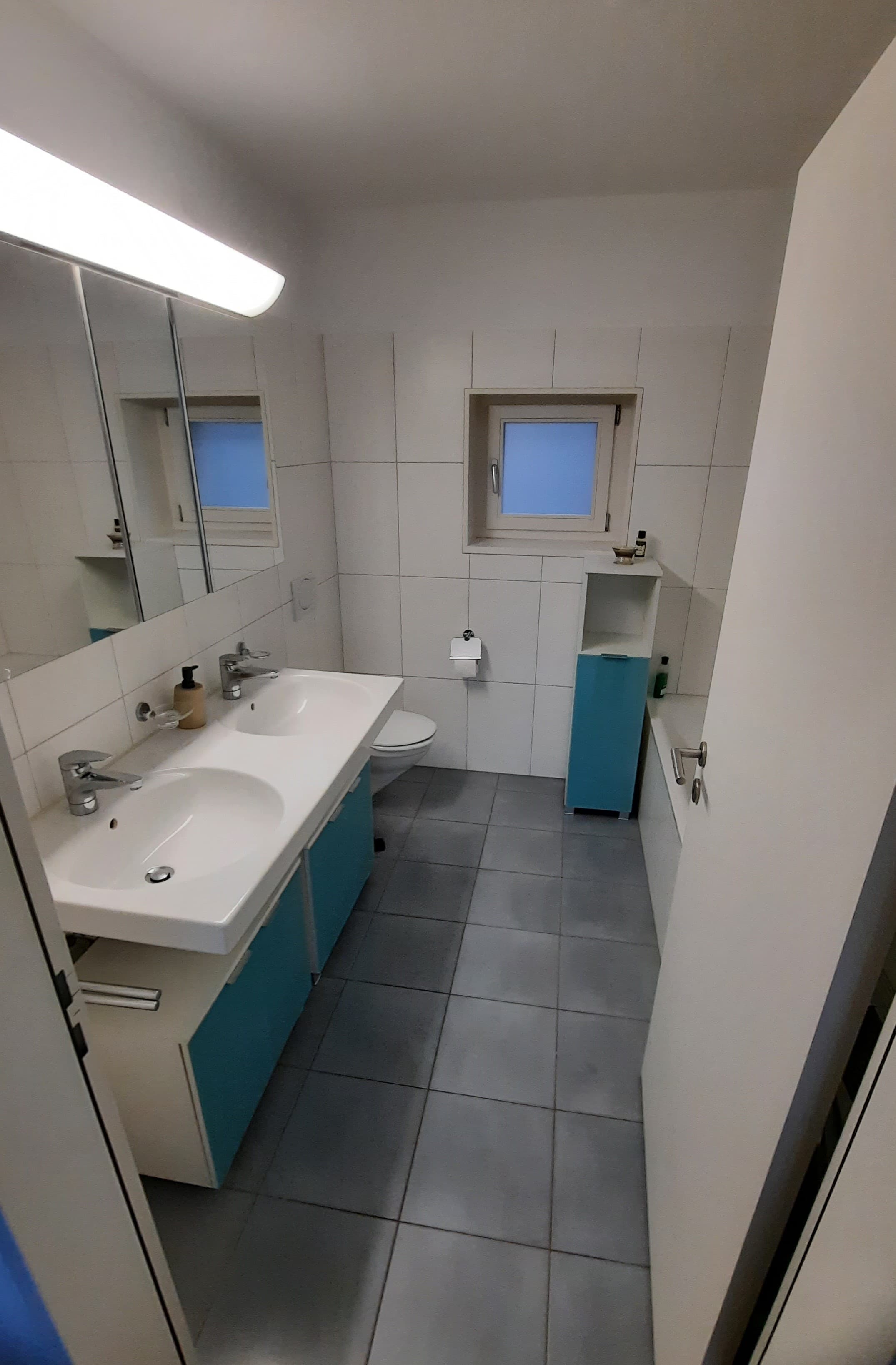 Das freie Zimmer ist unmöbiliert, 16 m2 gross und hat eine grosse Fensterfront. Ausserdem verfügt es über ein eigenes Badezimmer (6 m2) mit Badewanne, Doppellavabo und Toilette. Einzig den Waschturm würden wir uns teilen.