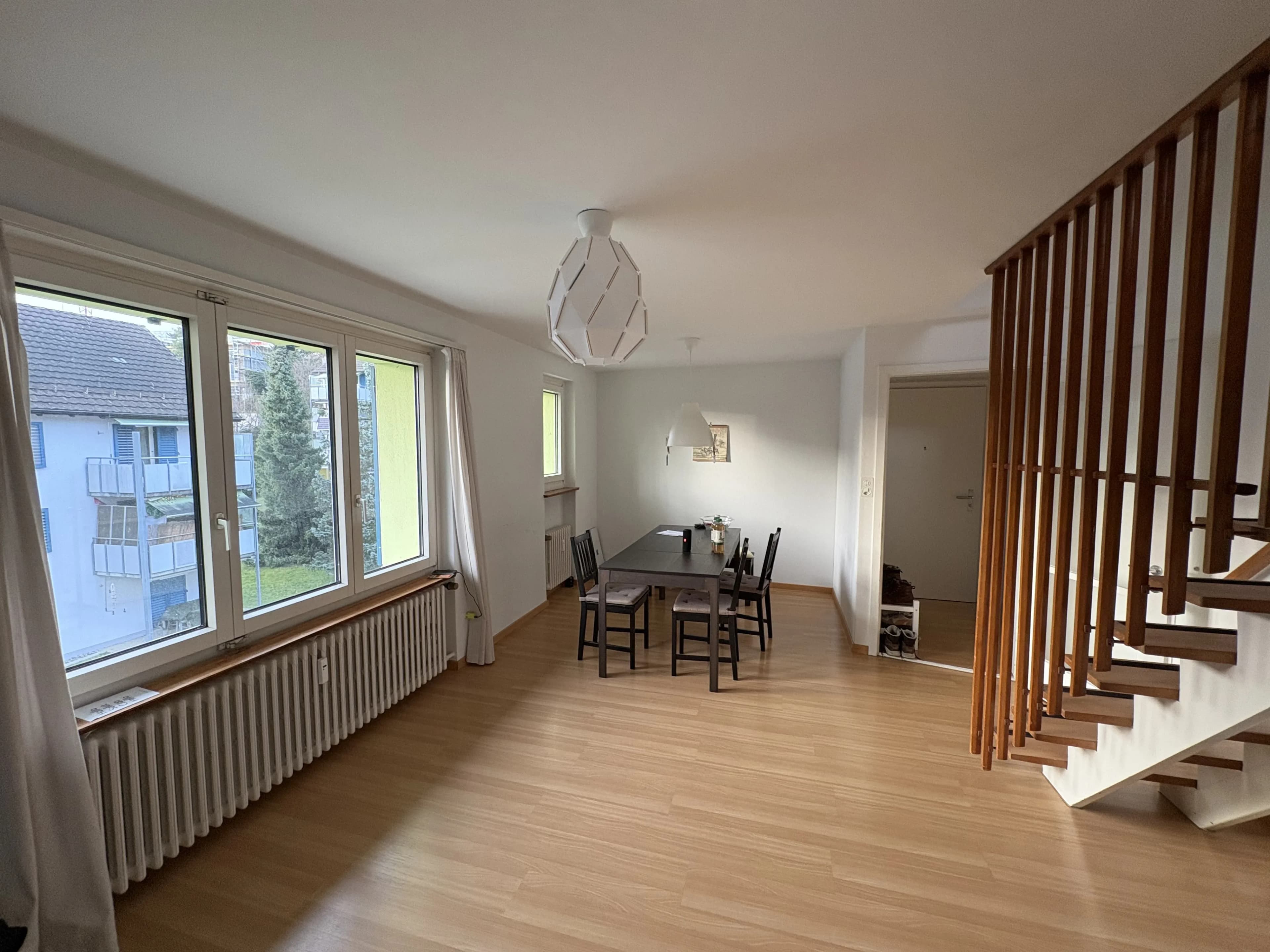 Das Wohnzimmer ist vollständig möbliert, und die Möbel können kostenlos übernommen werden. Zusätzlich gibt es einen Velokeller, ein grosses Kellerabteil sowie einen Dachboden, ideal für dein Velo oder deine Skiausrüstung.