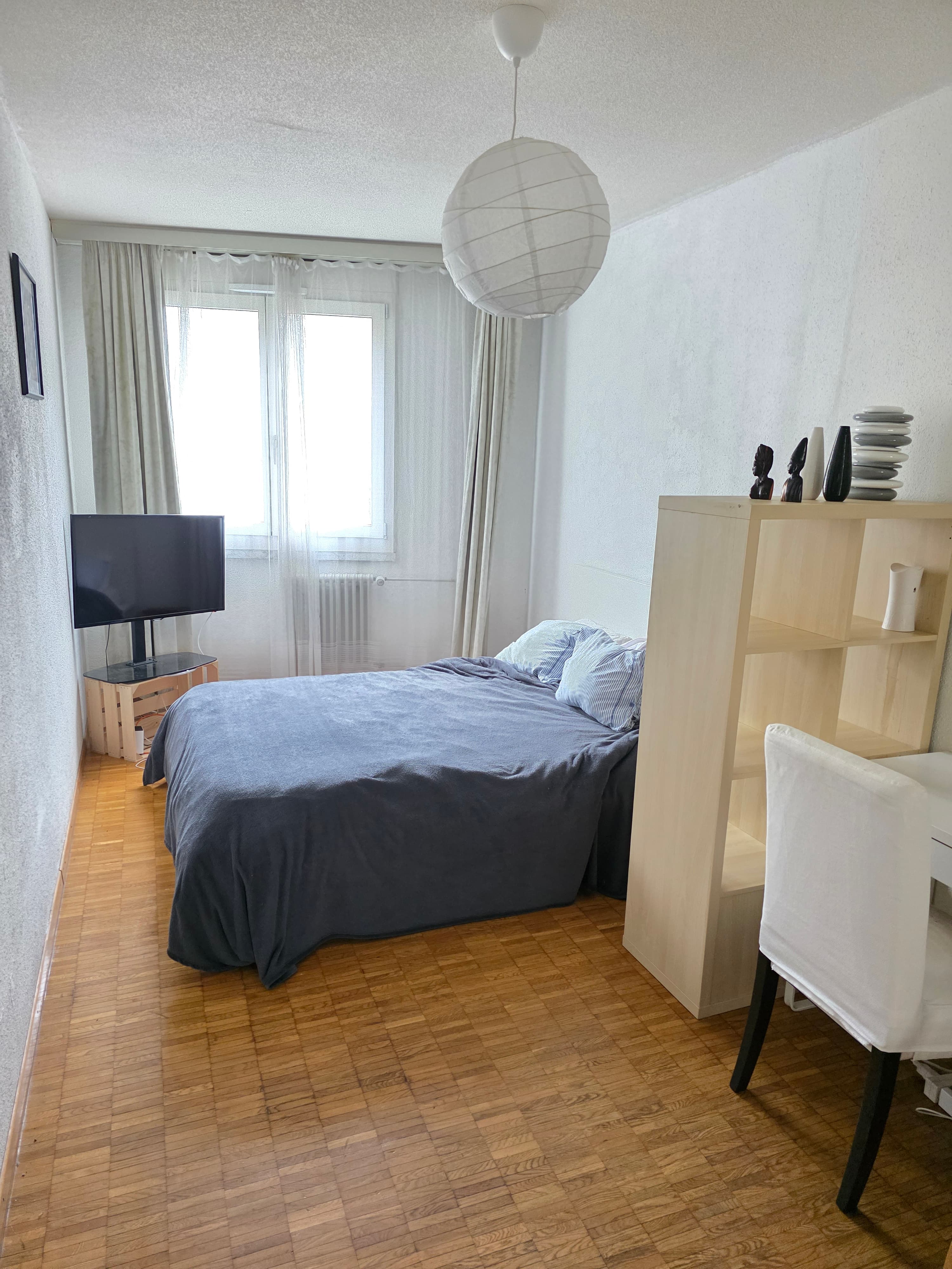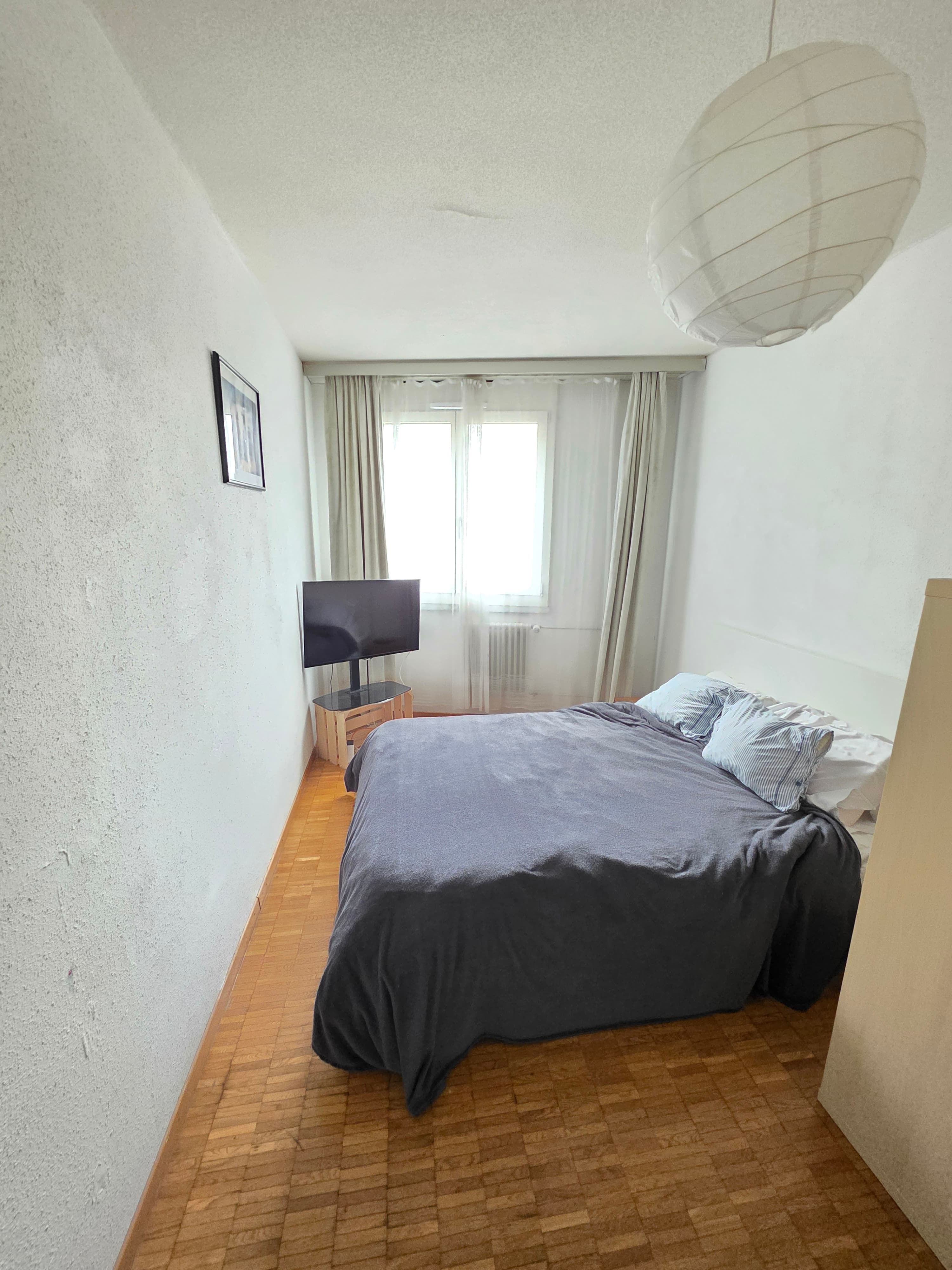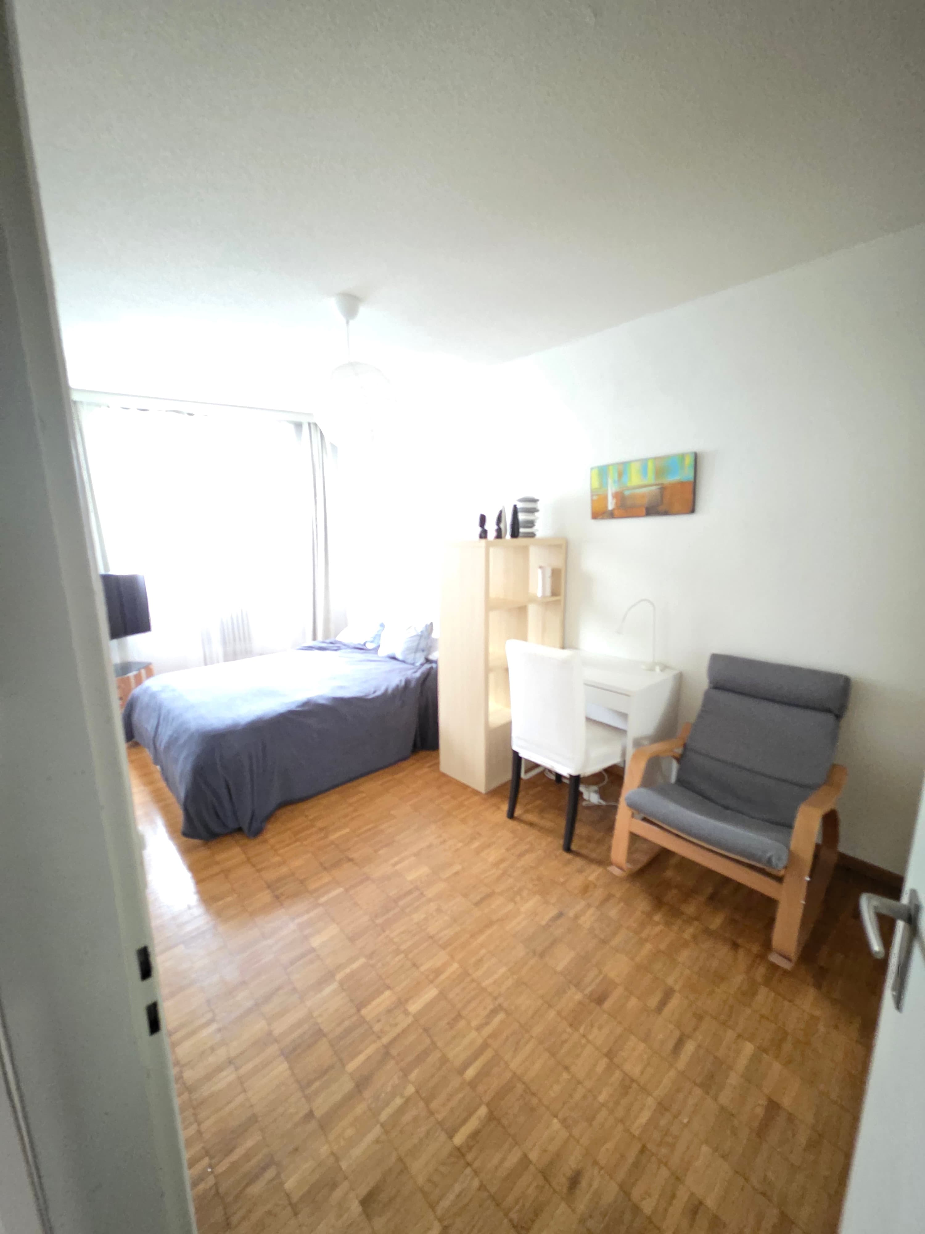 Je propose une belle chambre, calme, spacieuse et meublées (lit, armoire, bureau, étagère, TV).