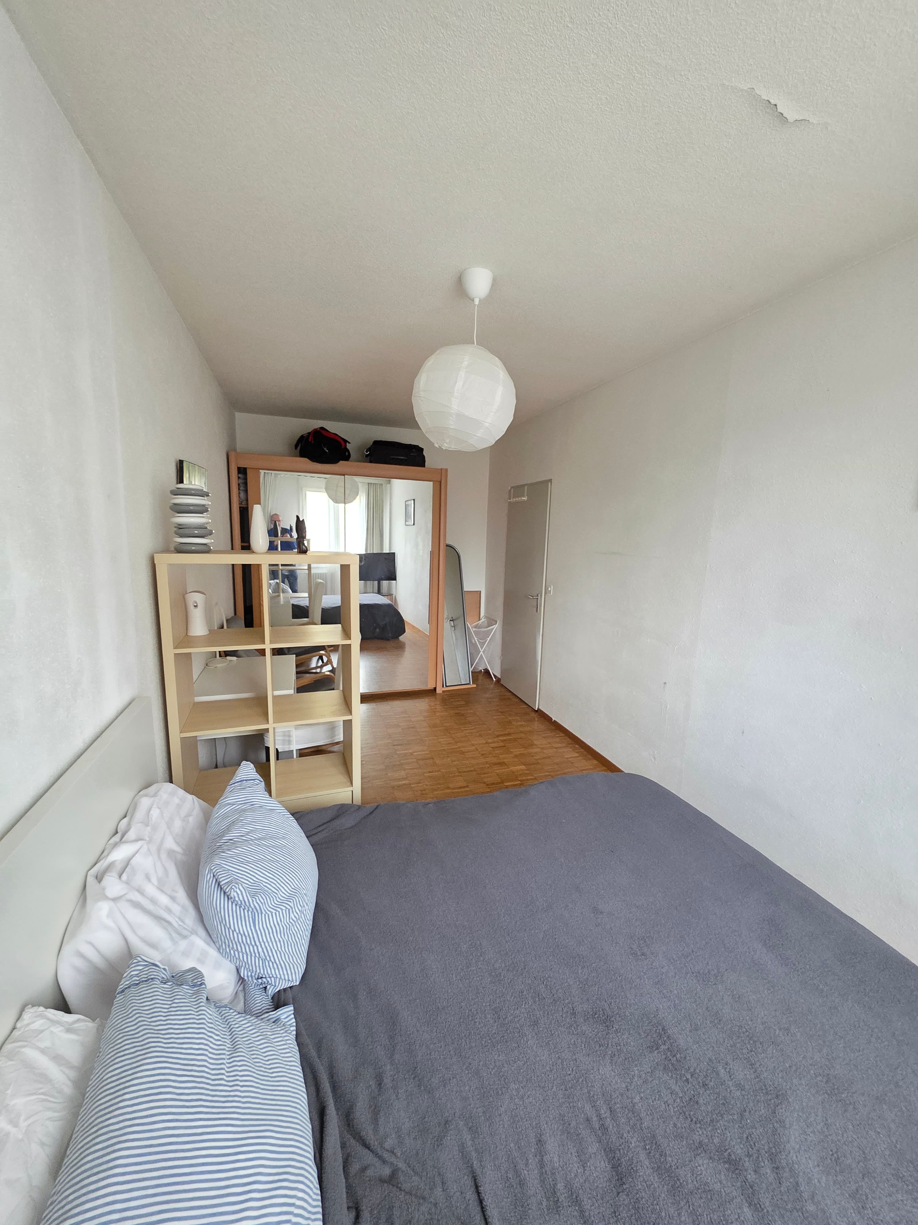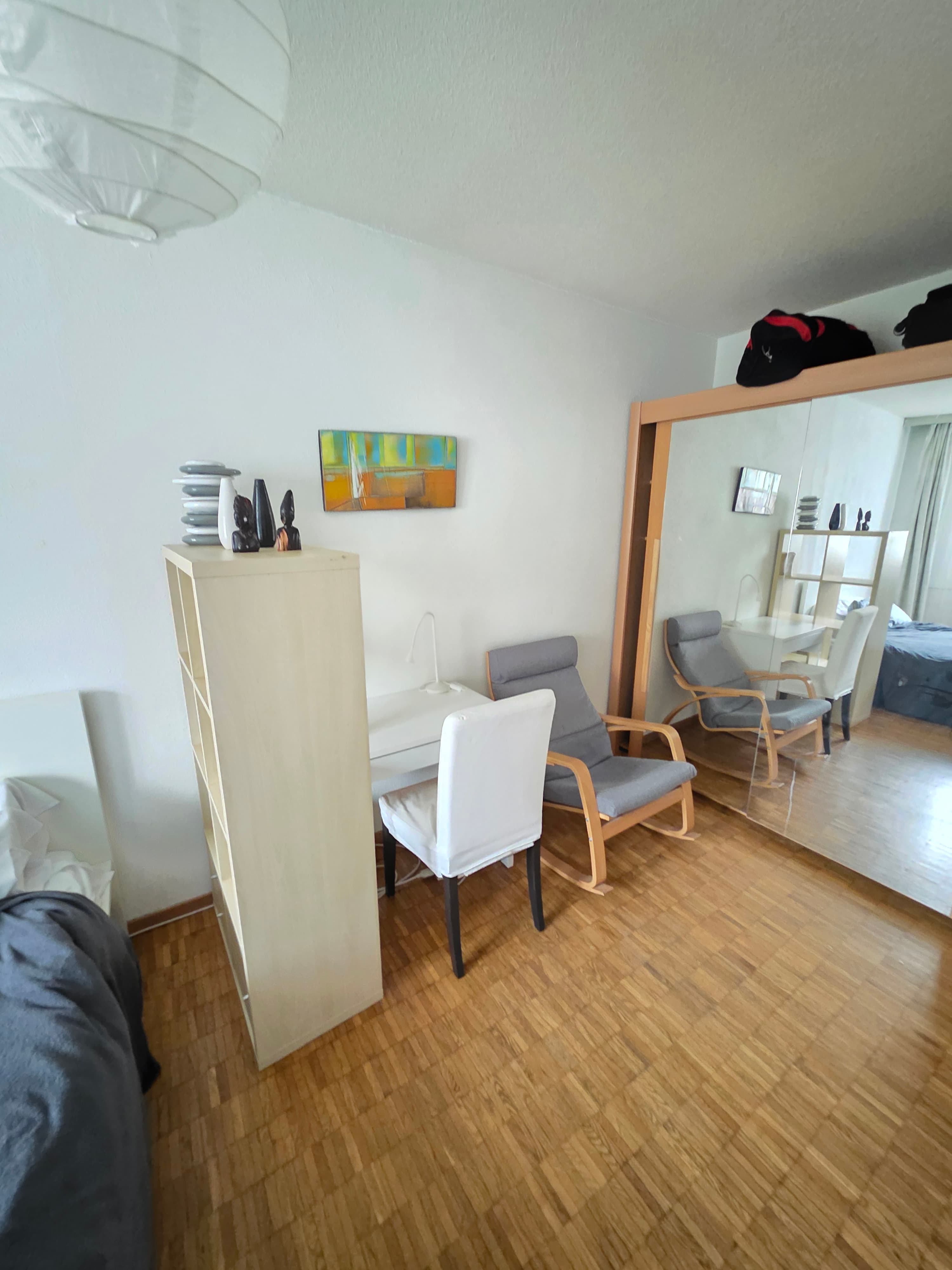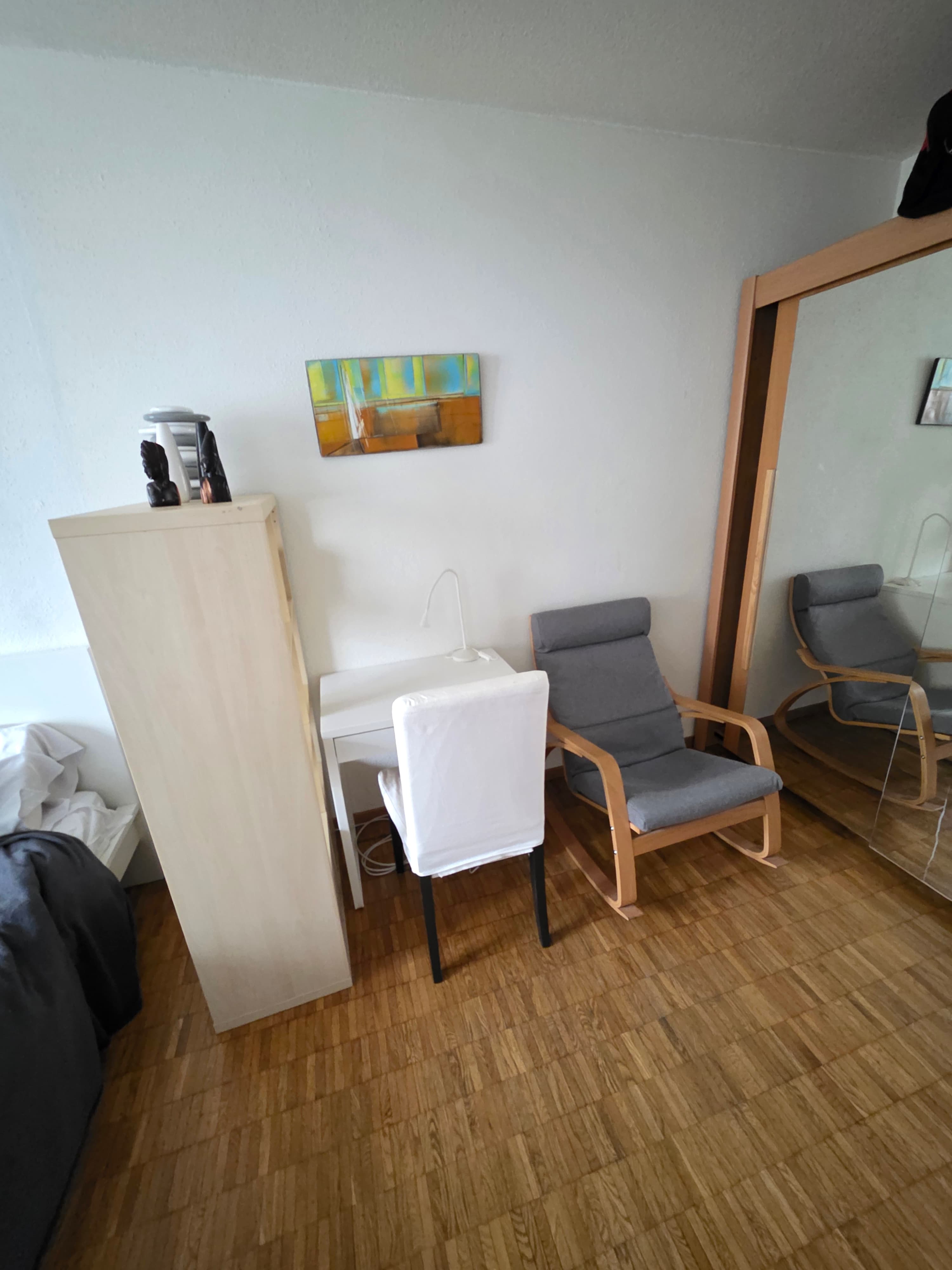 Je propose une belle chambre, calme, spacieuse et meublées (lit, armoire, bureau, étagère, TV).