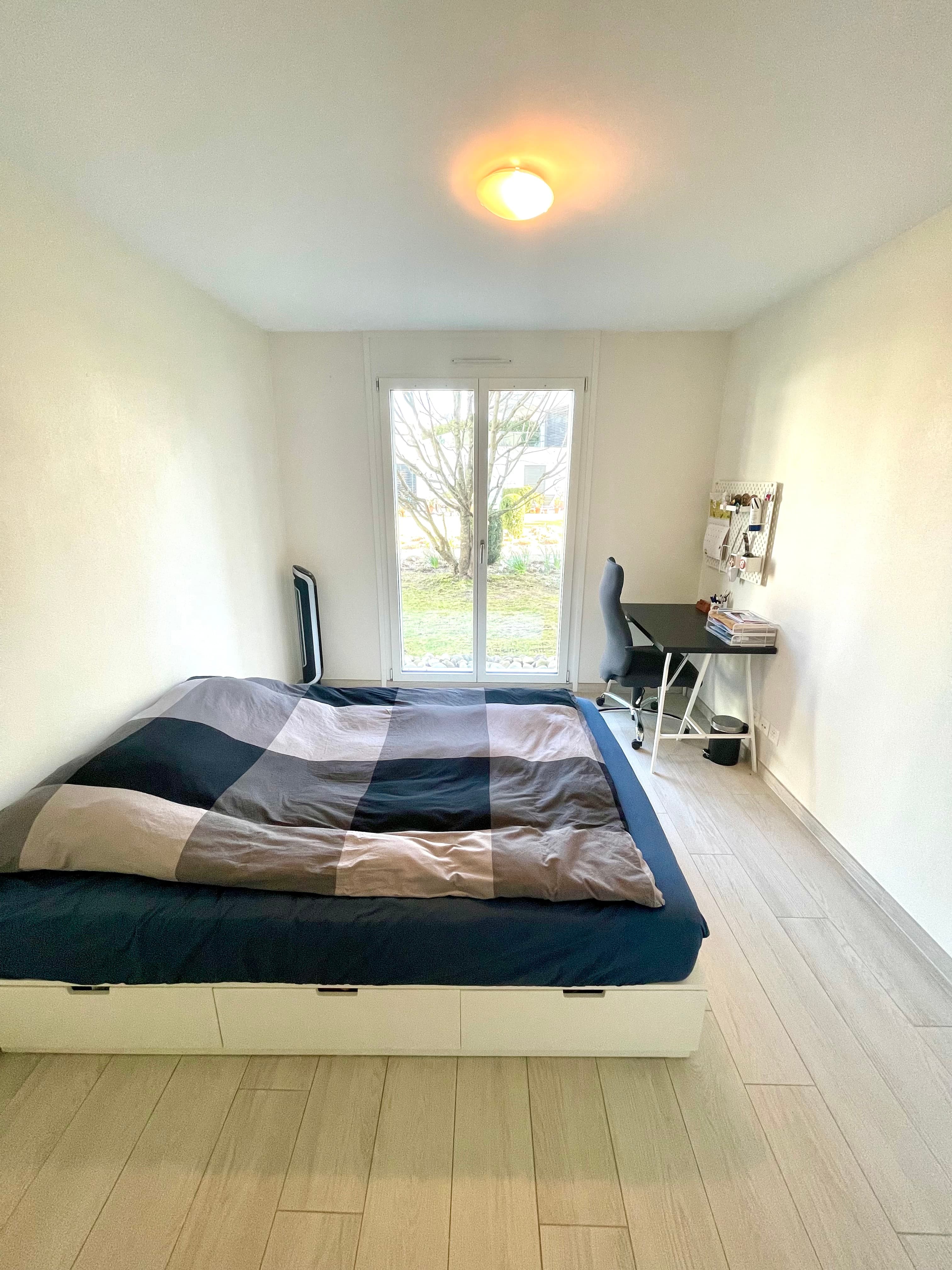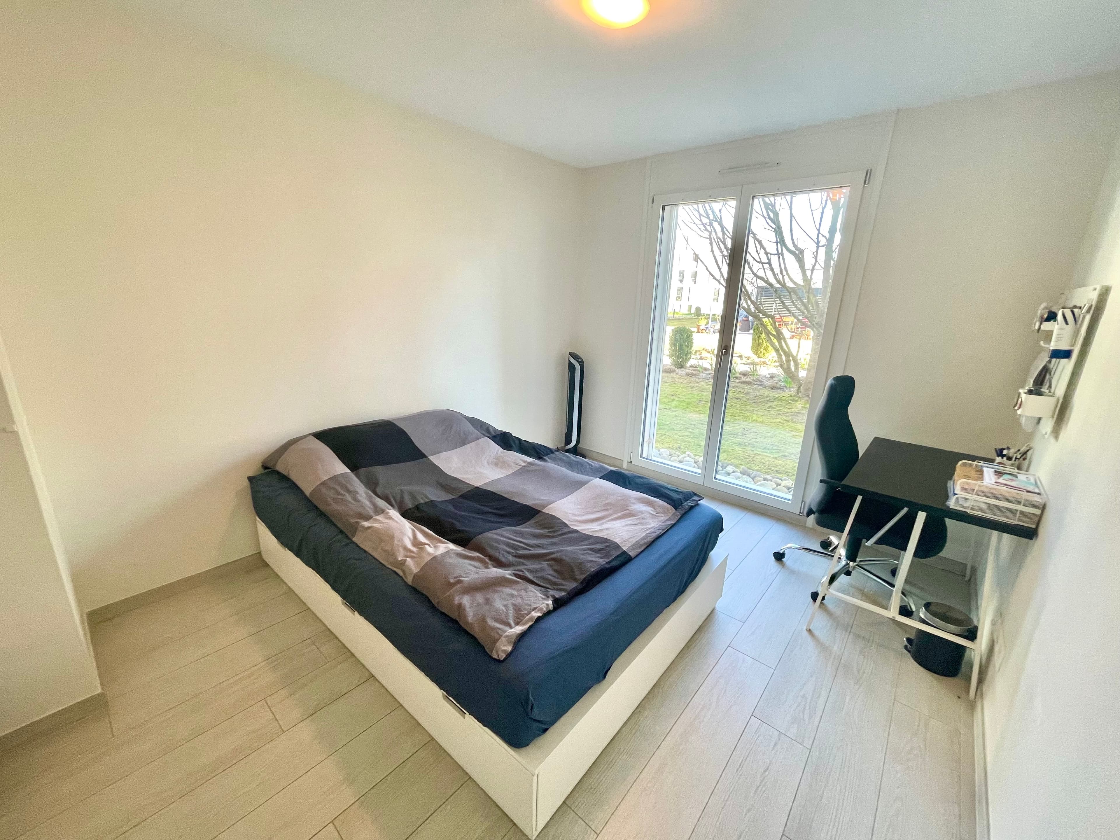 The apartment is shared with three very friendly flatmates (32M, 26M, 20M) from Poland, Austria and Luxemburg, who work or study in the EPFL area. The room itself is spacious (13 m²), bright with plenty of natural light, and has a large window overlooking the internal garden. The bathroom is shared only with one tenant (26M), who is very clean and respectful.