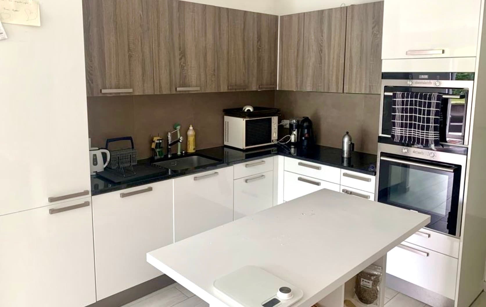 The apartment also features a fully equipped modern kitchen. In addition, there is a garden with outdoor furniture and extra storage space.