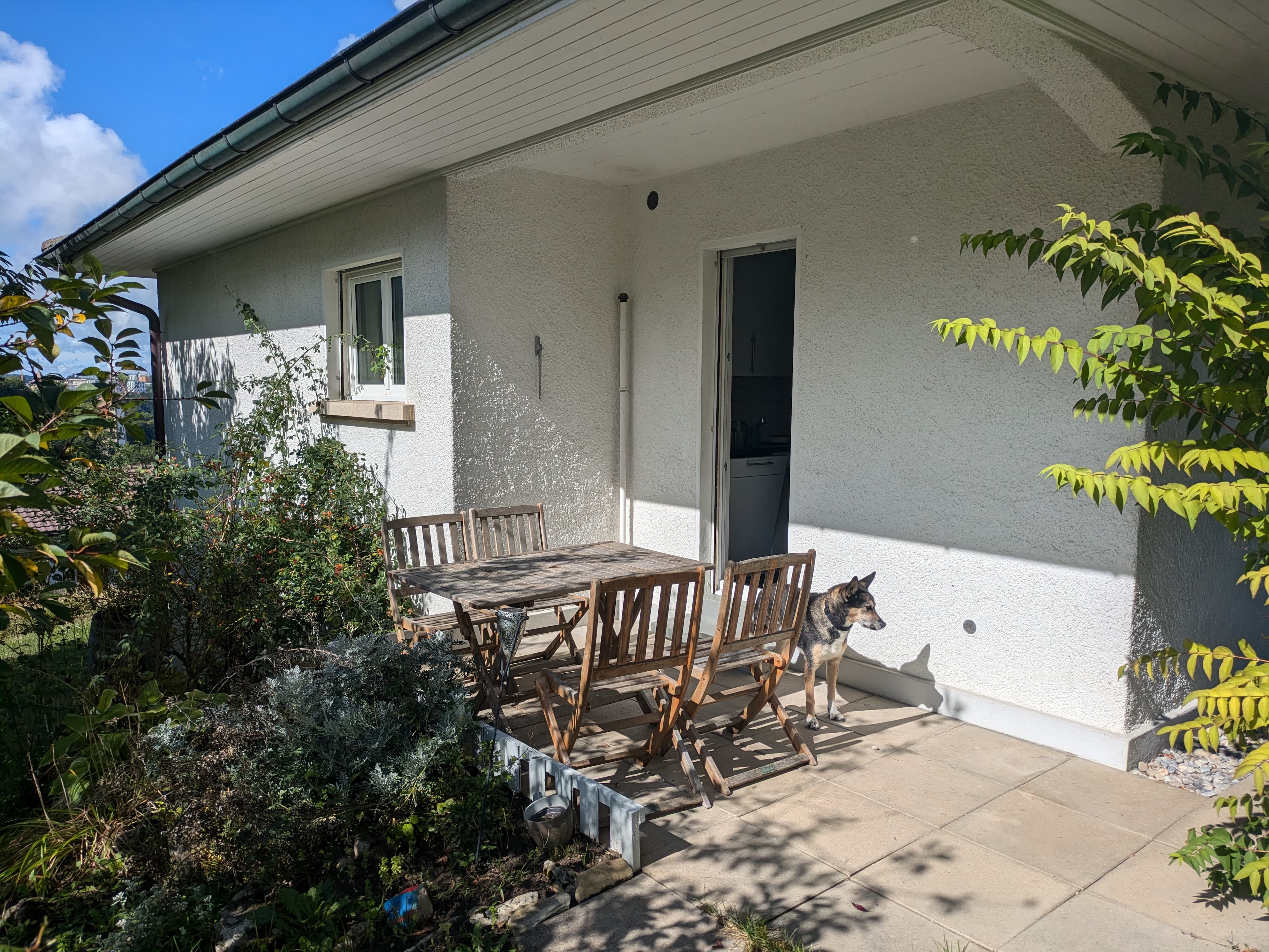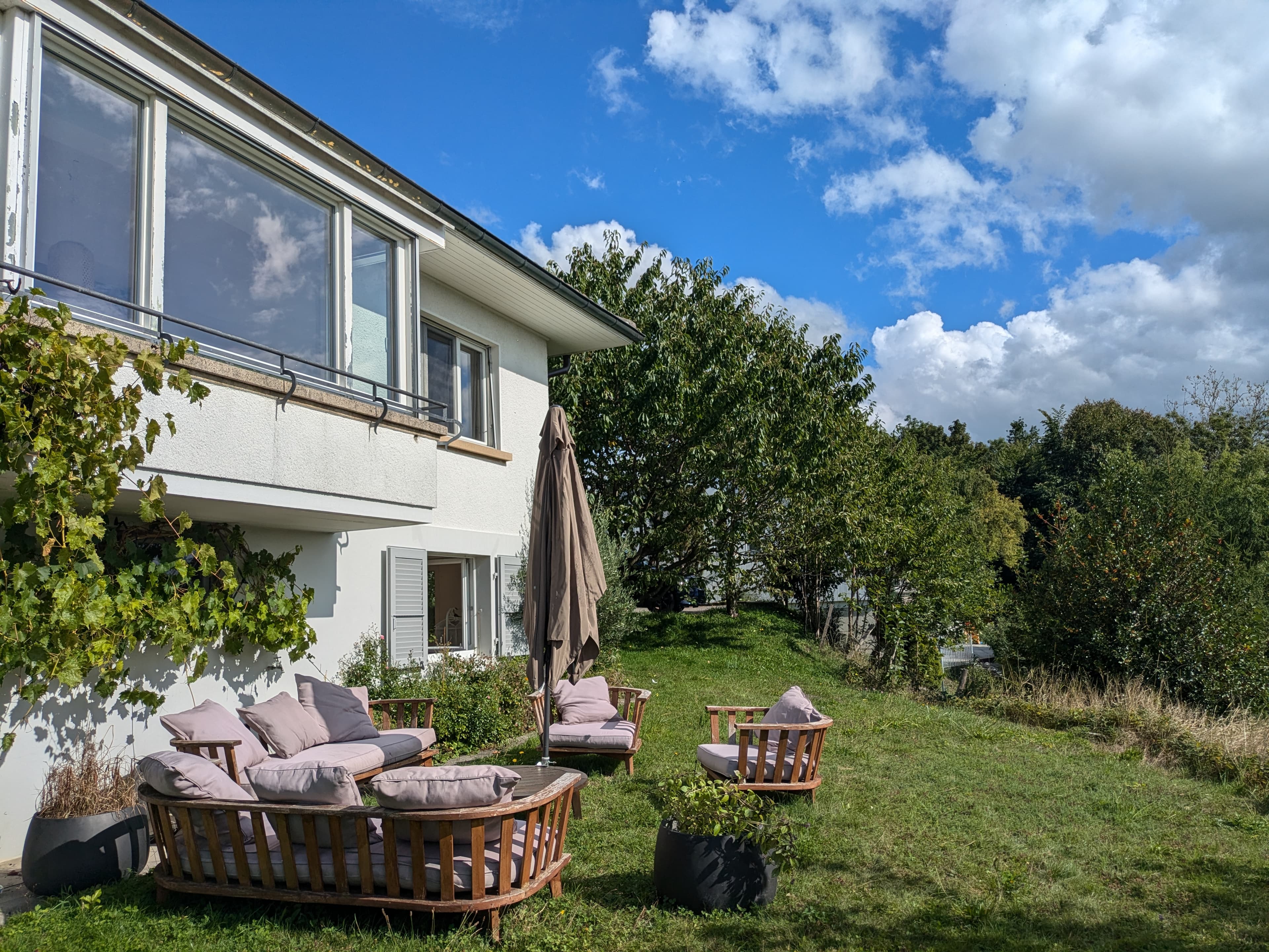 Située au Schönberg, à 2 min de l’arrêt de bus, la maison est sur deux étages et entourée d’un joli jardin arborisé et avec une vue dégagée.