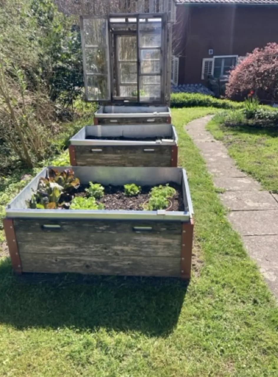 Garten mit Feuerschale und Hochbeeten