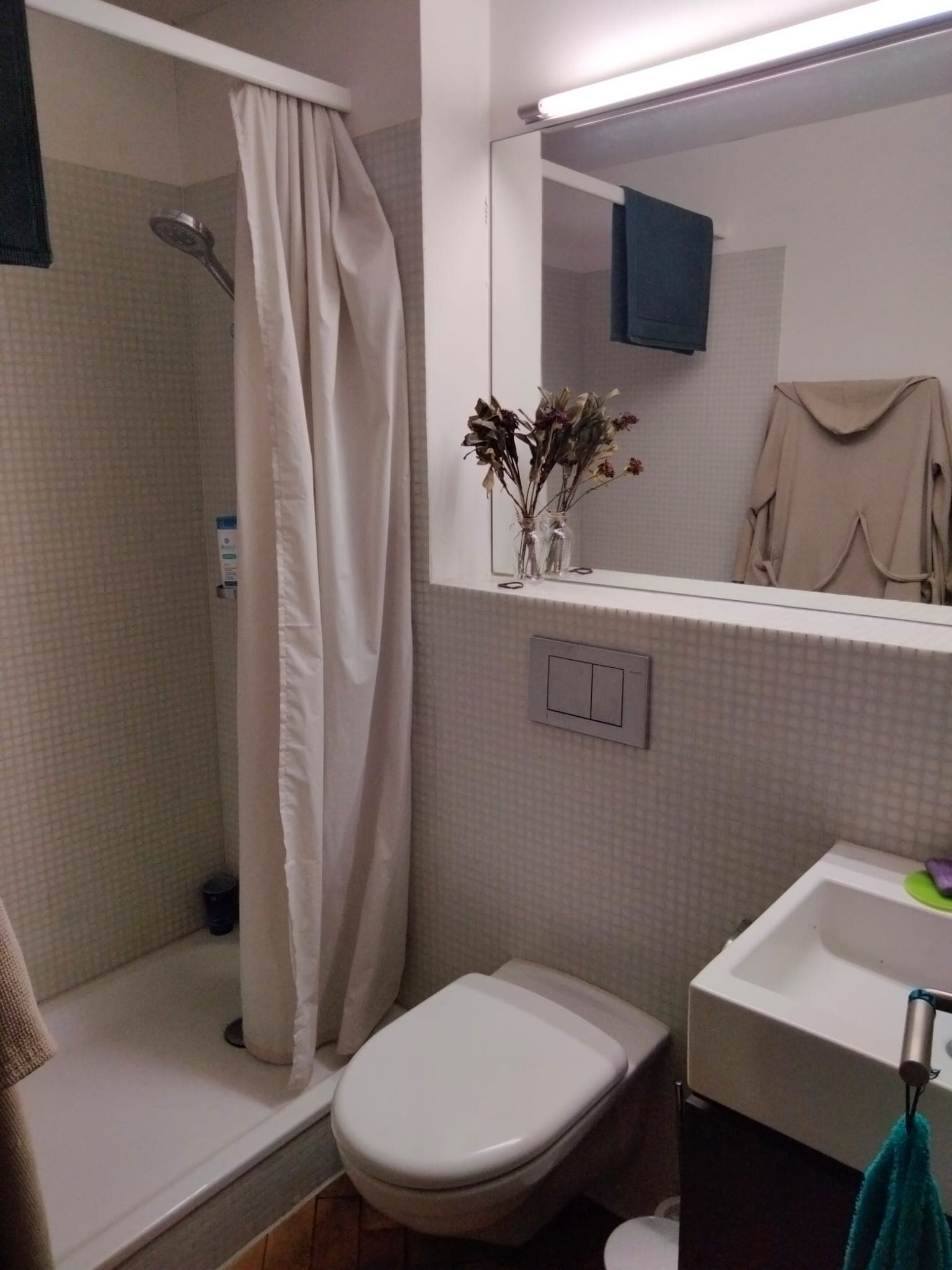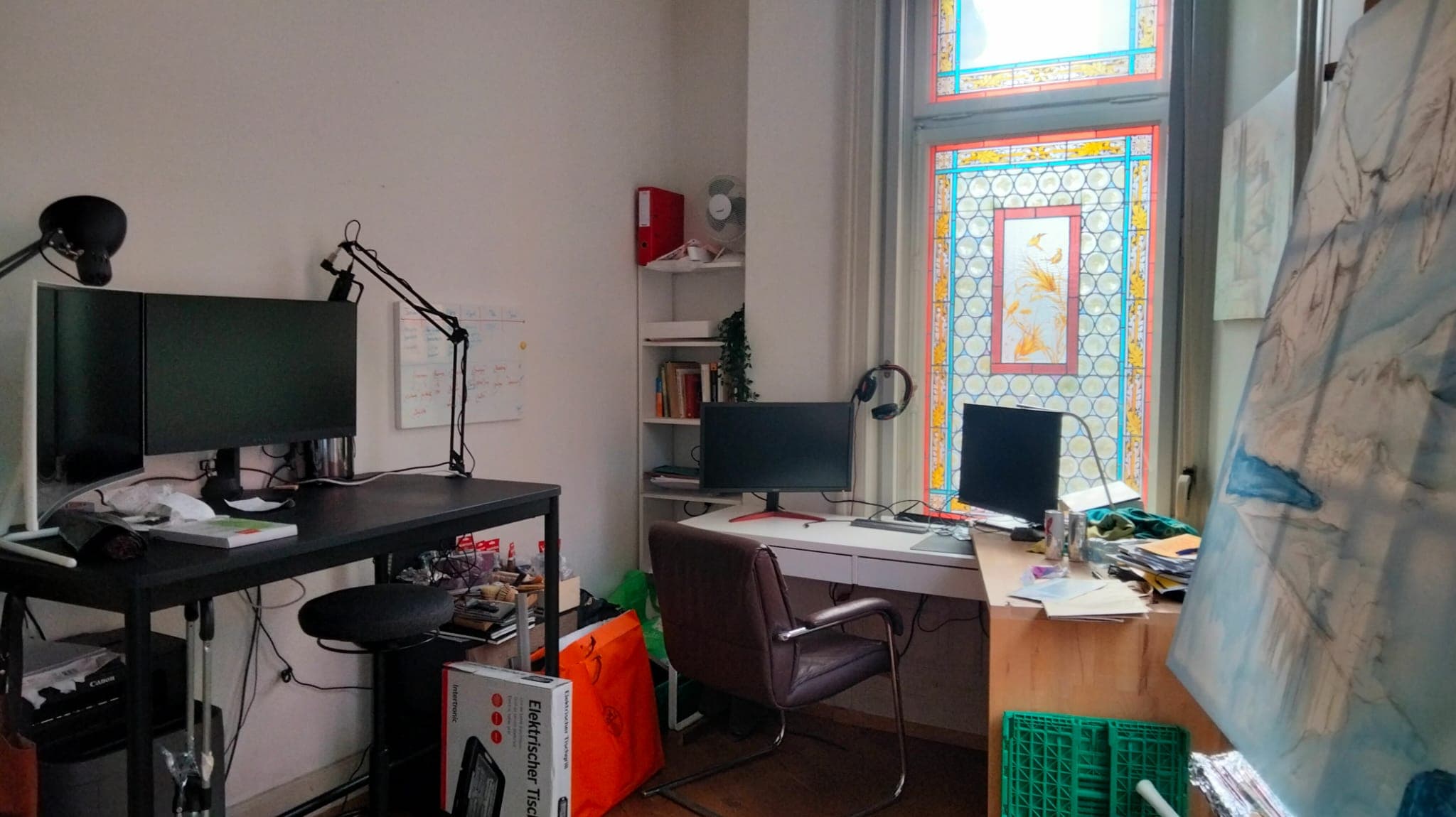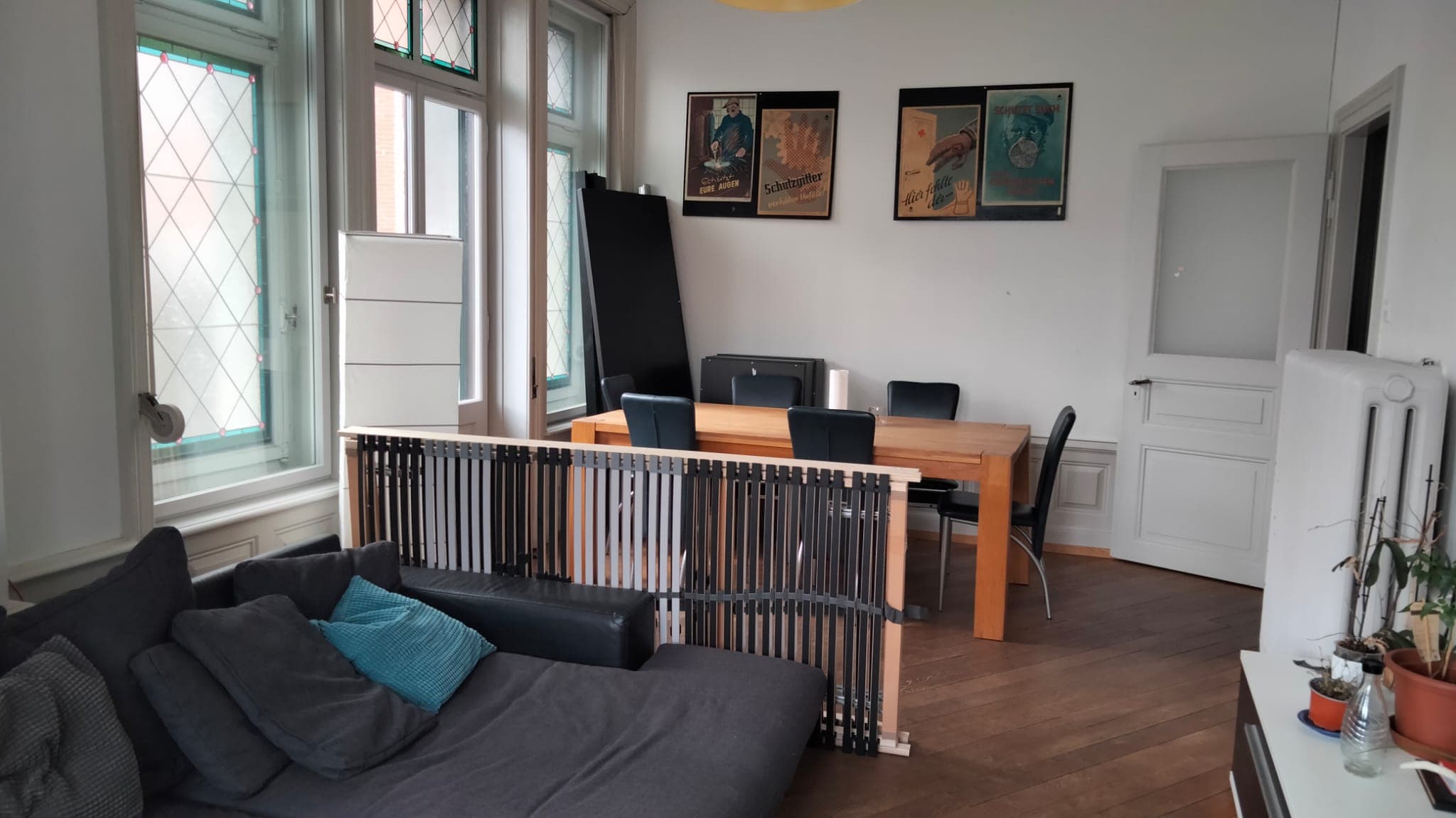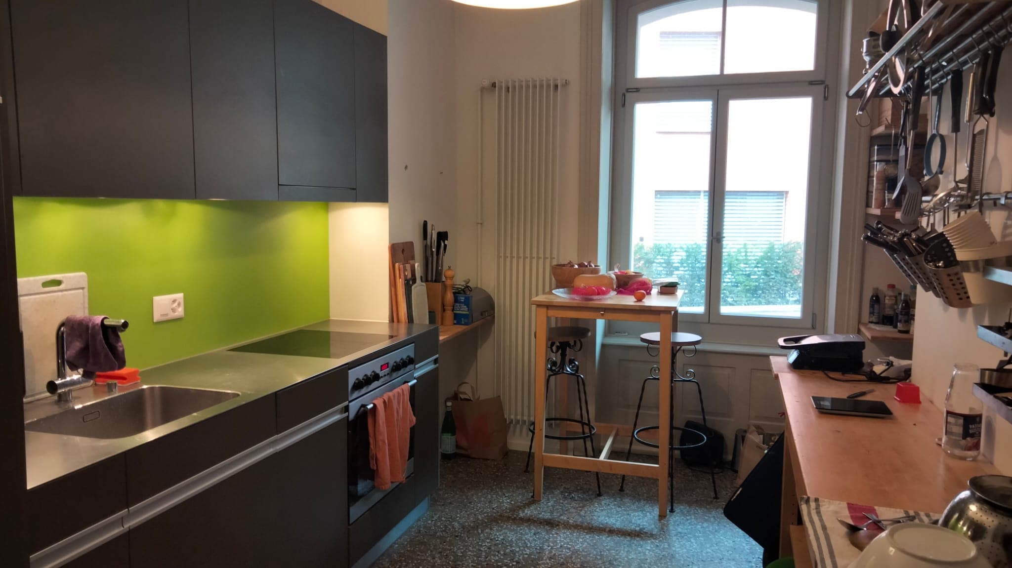 Die Wohnung wird mit zwei weiteren Personen zwischen 25 und 30 Jahren geteilt und umfasst eine Küche, ein Wohnzimmer, ein kleines Büro und einen Garten.
