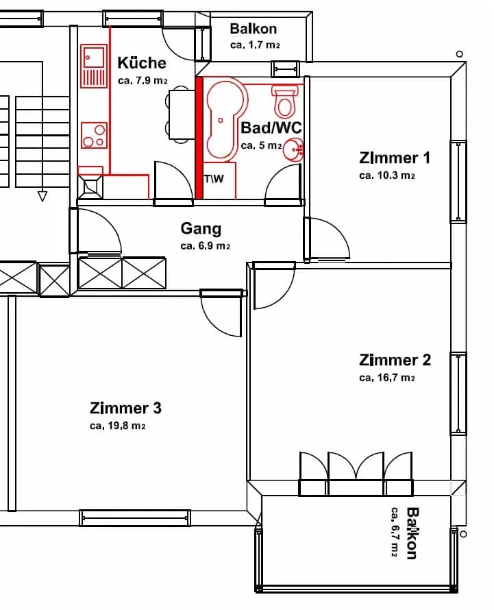 Die Wohnung besteht aus drei Zimmern: Ich (Hauptmieterin) bewohne das andere grosse Zimmer sowie das kleine Schlafzimmer.