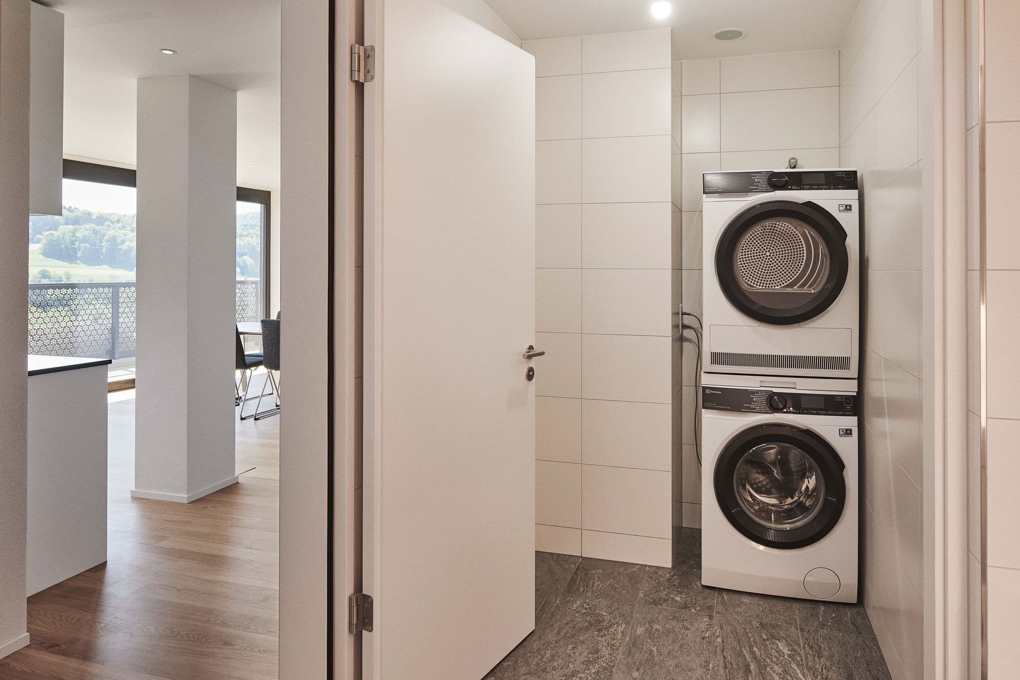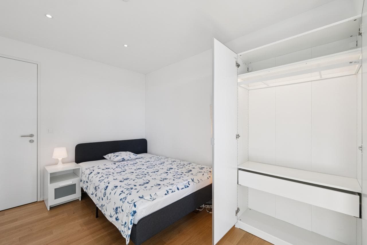 Die Wohnung selbst ist sehr modern ausgestattet und verfügt über eine große offene Küche, hochwertige Geräte sowie smarte Steuerung für Licht, Heizung und Klima.