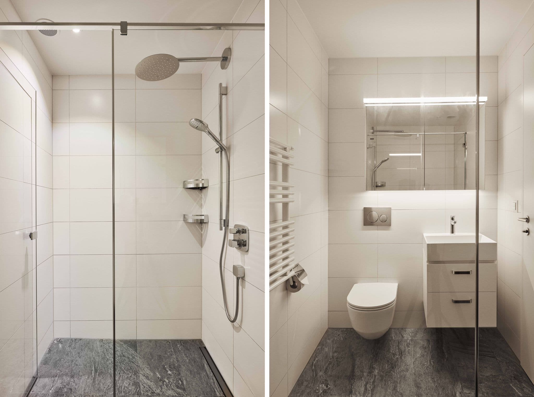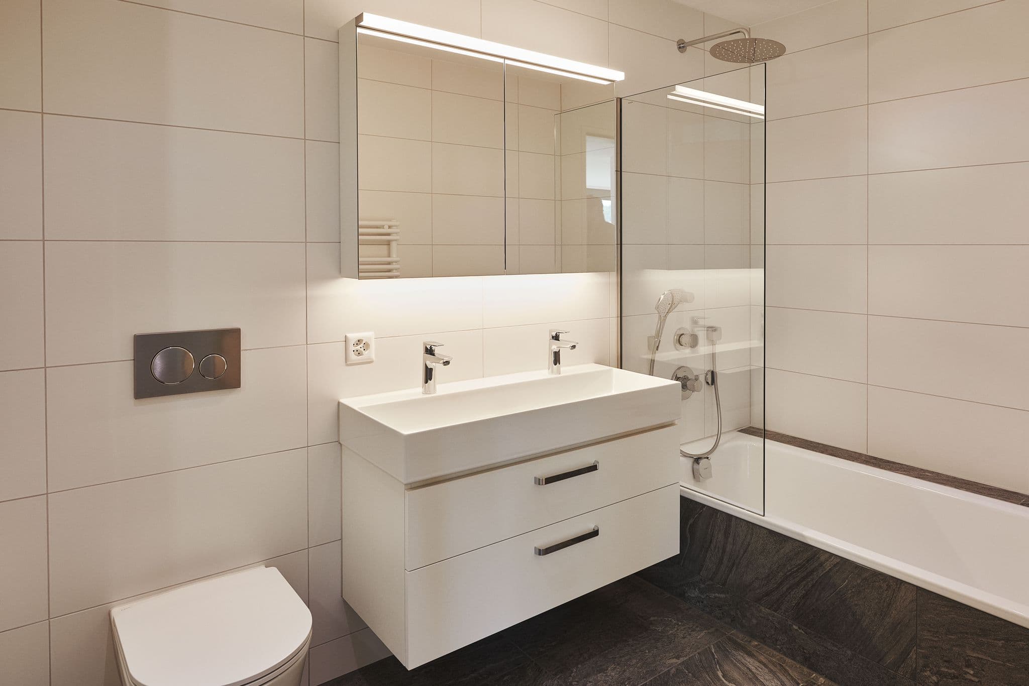 große offene Küche Waschmaschine und Trockner direkt in der Wohnung, Badezimmer mit Badewanne und Dusche mehrere schnelle Aufzüge im Gebäude moderner Neubau mit hochwertiger Ausstattung.