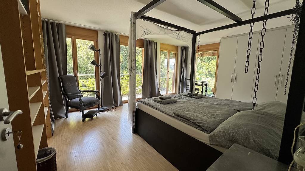 Vollmöbliert, mit Parkett und Bodenheizung, grosszügigen Einbauschränken und mit eigenem Badezimmer direkt vom Zimmer aus zugänglich.
