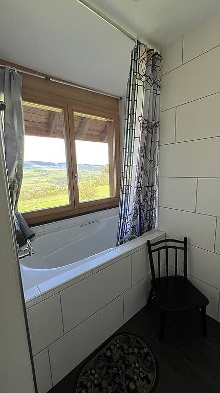 Zimmer 1 mit Badewanne und Balkon, Zimmer 2 mit Dusche und Panoramafenstern. Beide Badezimmer wurden im April 25 teilrenoviert.